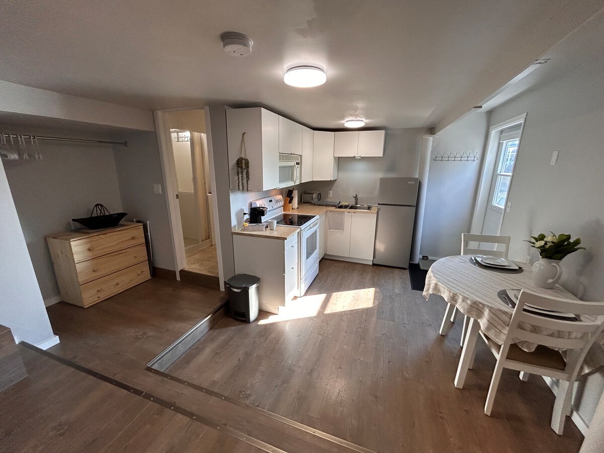 Acogedor, cómodo y bonito apartamento de 1 dormitorio y 1 baño justo en el centro de la ciudad. Con la privacidad y la seguridad en mente, siéntete como en casa con una cocina totalmente equipada, un amplio dormitorio con dos armarios y un espacio de trabajo designado. Como unidad privada, lo único que compartirás será una sonrisa entre los amigables habitantes de Yellowknif y las luces del norte.
