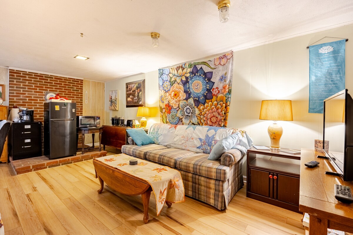 Unidad de dos habitaciones en la planta baja. Sin escalones. Entrada separada de la casa principal. Entrada privada y estacionamiento. Hay una habitación de entrada con una cama doble, cama individual, sofá y nevera completa. En una sala de estar separada, hay una cama tamaño queen, TV, baño, escritorio, mesa, microondas, horno de convección, freidora de aire, chimenea de gas. No hay horno. En el exterior hay un gran área para usar la parrilla de gas exterior, la mesa de picnic y el fogón. Se permiten perros y deben mantenerse con correa cuando estén afuera. Por favor, NO GATOS. El propietario es alérgico.