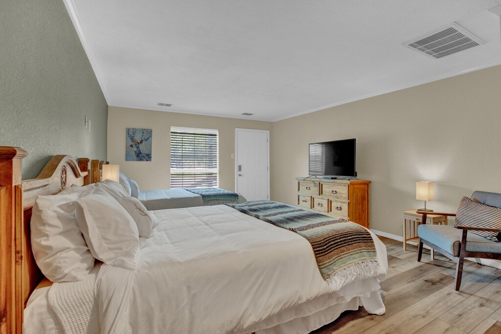 El doble de camas, el doble de diversión. Ya sea que viajes en familia, con amigos o simplemente como un poco de espacio adicional para relajarte, esta habitación está lista para todo. Dos cómodas camas tamaño queen, un amplio baño con ducha con efecto de lluvia y un escritorio para planificar tu próxima aventura en Hill Country o responder a ese correo electrónico que no pudiste evitar. Con un microondas, una mininevera y un hervidor eléctrico con té y café de cortesía, tienes todo lo que necesitas para instalarte y quedarte un rato.