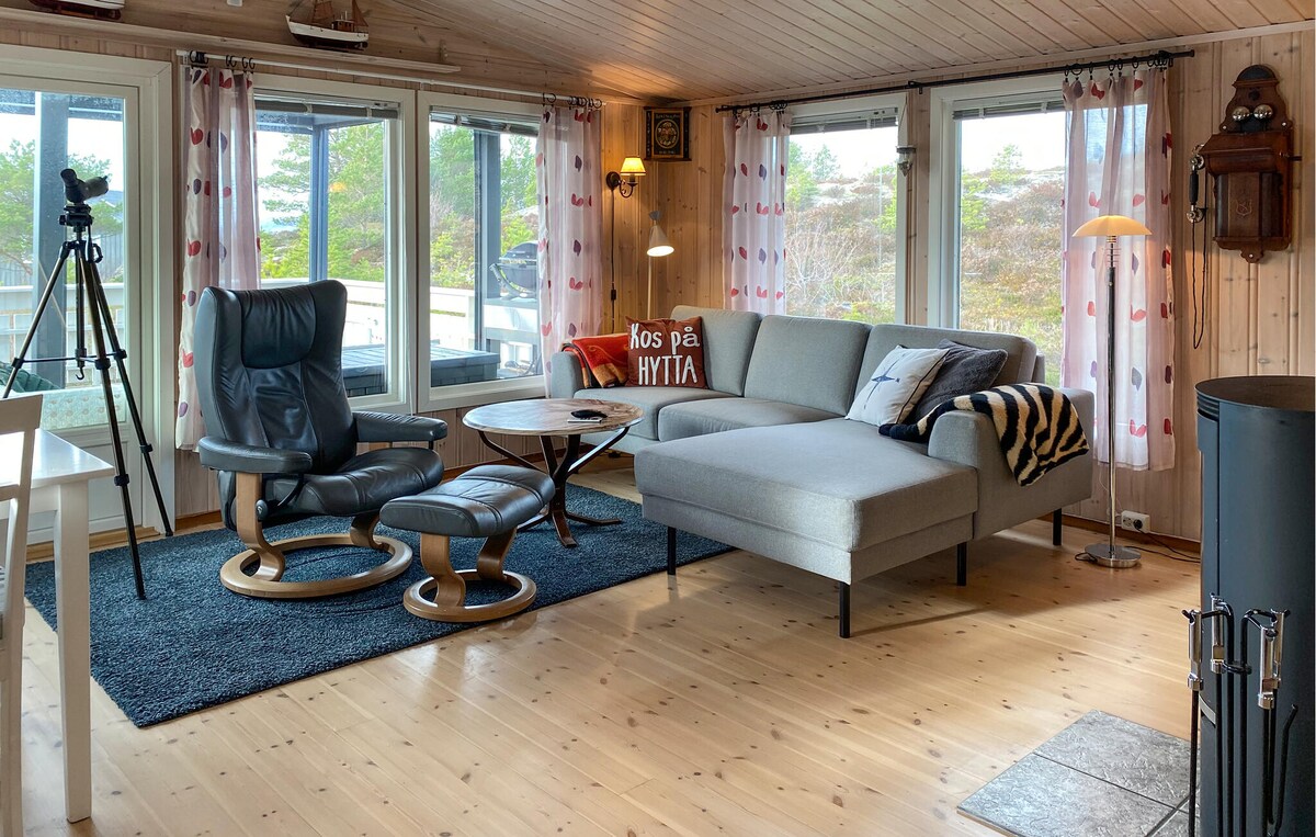 Gran casa de vacaciones aislada durante todo el año en primera línea de mar con jacuzzi y wifi. El área es famosa por su paisaje costero salvaje y exótico. Las áreas marinas exteriores son ricas en peces y mariscos, excelentes para la pesca o el buceo. La playa de arena en las inmediaciones está bien tanto para familias con niños como para aquellos que se dedican a bucear libremente. Desde la cabaña se puede ver la puesta de sol sobre el archipiélago de Tarva con los molinos de viento en Valsneset en silueta. Si tienes suerte, puedes sentarte en el jacuzzi y ver el águila marina bailar o las luces del norte bailar por el cielo.