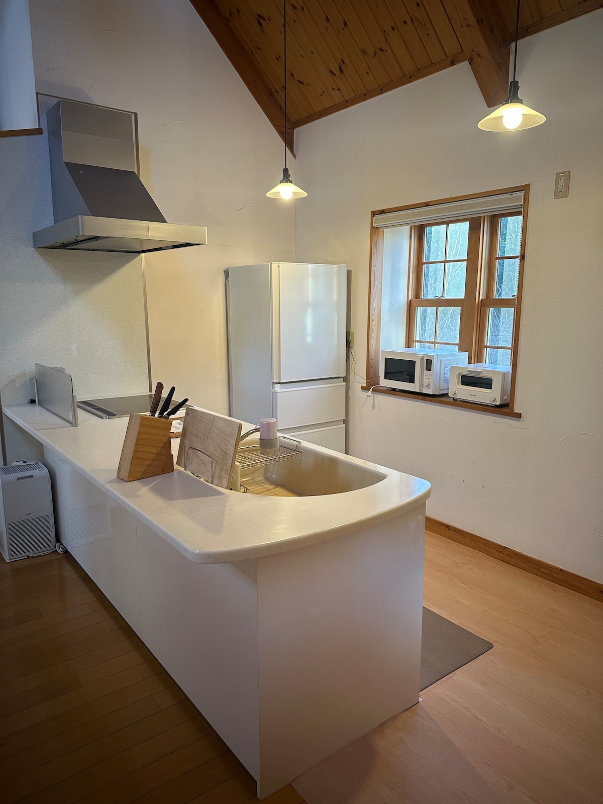 Esta es una casa de campo nueva construida en 2022. Al entrar en la elegante casa con paredes exteriores negras, el pasillo de piedra que conduce a la sala de estar del techo alto te hará olvidar tu vida cotidiana. El baño al aire libre está rodeado de árboles y, en invierno, puedes disfrutar de un relajante baño con vistas a la nieve. Disfruta de un teatro privado en la sala de estar y el dormitorio con una pantalla de proyector de 100 pulgadas. Las pantallas y los escritorios también están disponibles para tu espacio de trabajo.