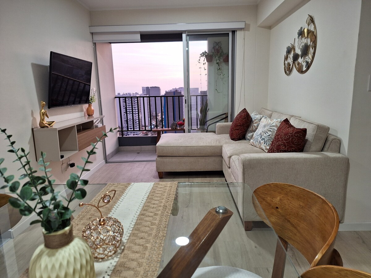 Moderno depa en el piso 17 con espectacular vista a la ciudad desde su balcón. Totalmente equipado: cocina completa, lavadora, Smart TV, WiFi y escritorio ideal para home office. Cuenta con cochera y espacio para bicicletas. Relájate con su decoración especial y luces retro en los dormitorios. El edificio ofrece gimnasio, zonas de parrilla, coworking, juegos para niños y adultos, salón de eventos y jardines. Ideal para estadías cortas o largas.