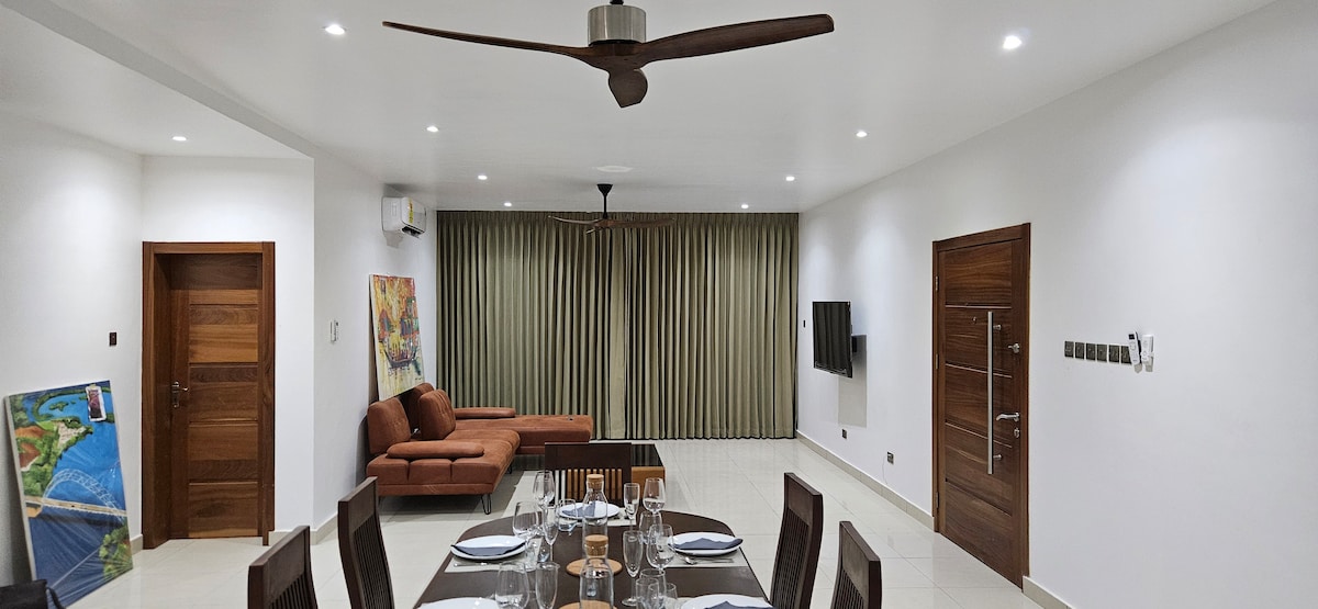 ¡Te damos la bienvenida a una experiencia única! Si estás buscando un lugar hermoso con un toque de lujo, algo inteligente y elegante, con un impresionante jardín, piscina, jacuzzi y gimnasio, no busques más. ¡Este es el lugar perfecto para ti! Nuestro departamento está idealmente situado, al alcance de las mejores atracciones de Accra. Estamos a solo 25 minutos del centro comercial Accra, a 10 minutos del centro comercial Achimota, y se puede llegar a la playa en solo 30 minutos. Somos fácilmente accesibles desde el aeropuerto, a solo 11 km de distancia.