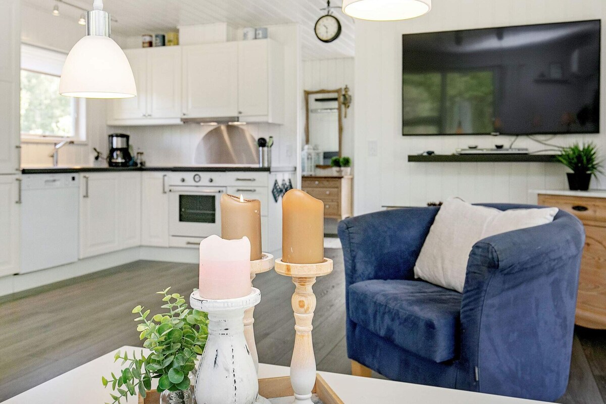 Hermosa casa de madera sueca, en una gran parcela. Hay una bonita cocina al aire libre con barbacoa y lavabo. Hay una ducha exterior con calentamiento solar. Hay bicicletas disponibles en la casa: 1 tándem, 2 bicicletas de montaña, 1 bicicleta para hombre y 2 bicicletas para mujer, además de un remolque para bicicletas. Juguete de arrastre para niños pequeños. Hay un dormitorio con una cama matrimonial, una habitación con una cama de 3/4 y una habitación con literas, en la que una de las camas es una cama matrimonial pequeña. También hay un loft grande. Refugio en el jardín para dormir al aire libre. Hay un cargo de DKK 3 por kWh de electricidad. Los huéspedes son responsables de limpiar antes de salir de la casa.