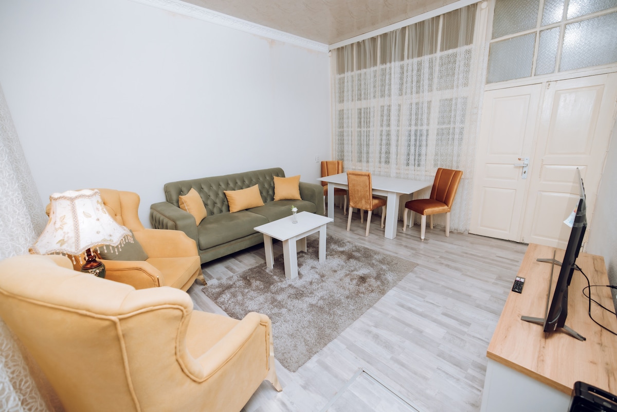 Enjoy a relaxing stay in this spacious two-bedroom house in the very heart of Ganja. The home features a huge living room, a separate fully equipped kitchen, and a small private yard perfect for outdoor dining. Step outside and you are directly at the central city square, surrounded by cafés, shops, and attractions. Free parking is available. Ideal for families, couples, or small groups.