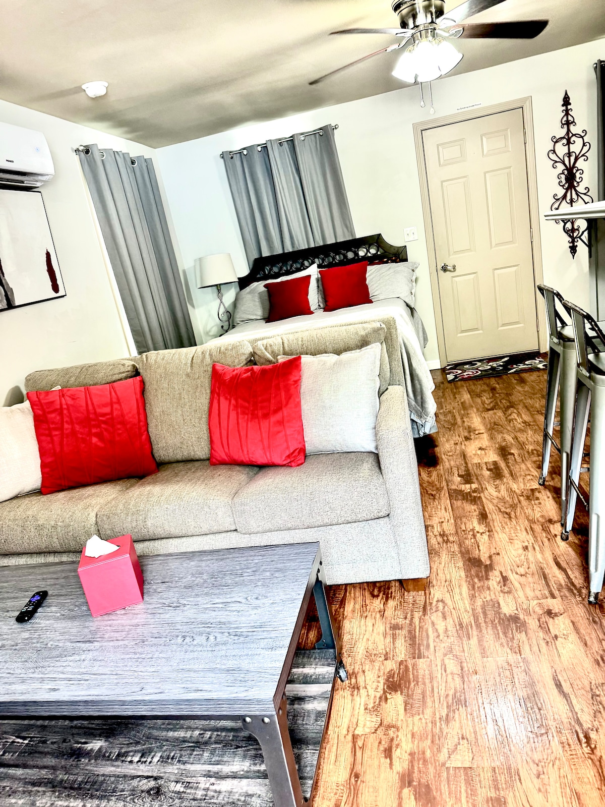 Tenemos todo lo que necesitas a un precio excelente. La habitación viene con una cocina totalmente equipada: refrigerador, estufa, microondas y tostadora. Gran televisor inteligente y acceso wifi. Cuentas de Disney + (con Hulu en la aplicación), Fandango, Paramount+, HBO, Peacock, ESPN y Vudu configuradas en la televisión. La comodidad es clave con una cama tamaño king con la parte superior acolchada súper suave y sábanas y edredón de la más alta calidad. El sofá se despliega en una cama tamaño queen. Cenador cerrado con asientos entre las unidades 2 y 3 para todos los huéspedes. Parrillas individuales y fogata