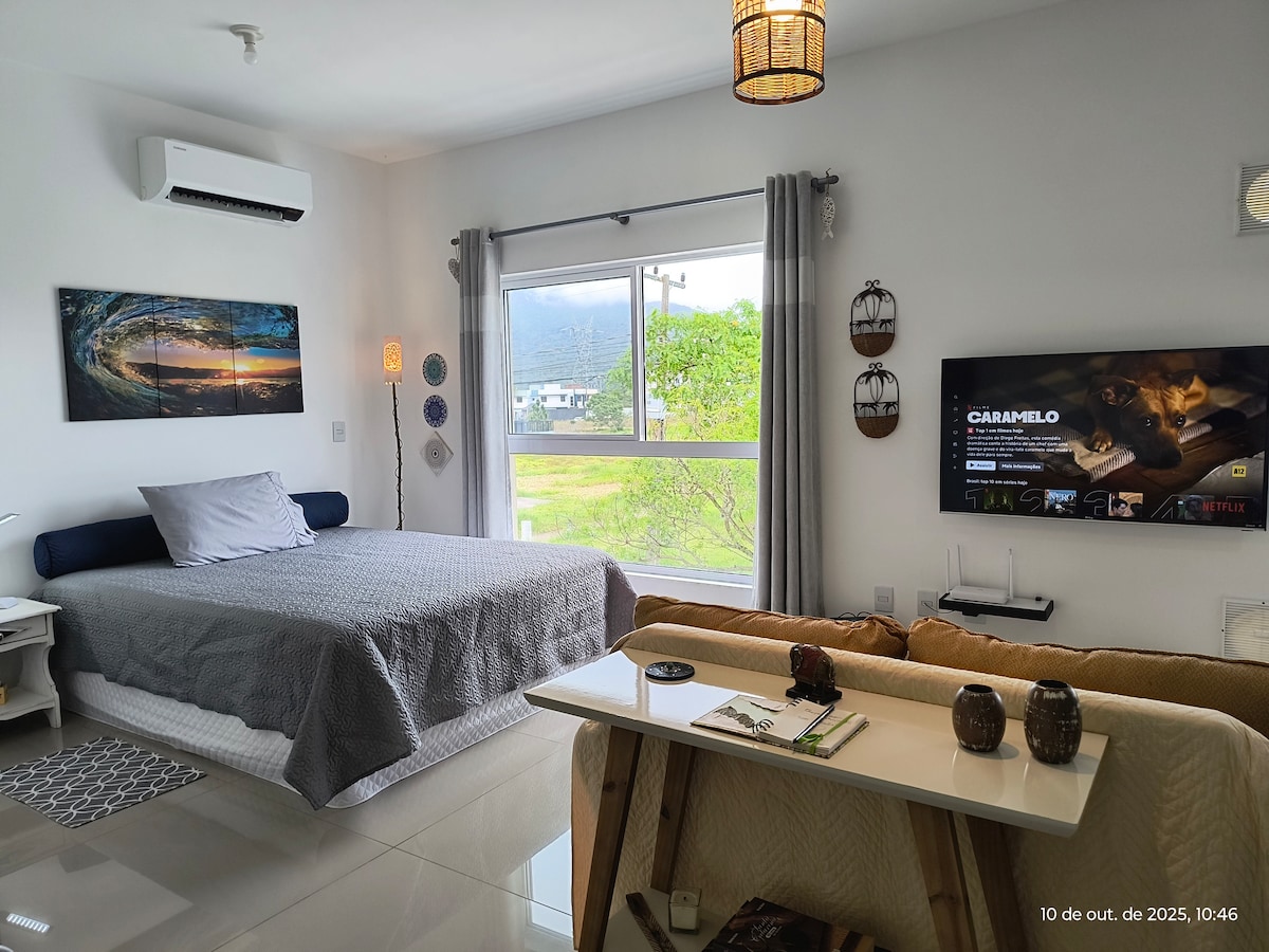 Estudio moderno, decorado y con aire acondicionado, ideal para parejas. Ropa de cama y baño completa, cocina equipada, TV inteligente y Wi-Fi de 1000 Mbps. Cómodo espacio de oficina en casa. Plaza de aparcamiento en garaje interior, ascensor y accesibilidad. Condominio familiar seguro en Alto Ribeirão, con un mercado autónomo y lavandería las 24 horas. Fácil acceso a las playas de Campeche y Morro das Pedras, el aeropuerto, el estadio Avaí y la base aérea. Llegada y salida autónomas flexibles hasta las 10:00 p. m. ¡Ideal para tu mejor experiencia en Floripa!