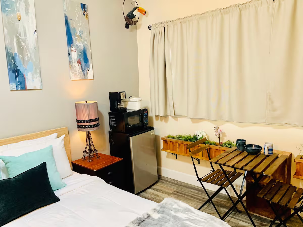 The cottage features full amenities that include: Tempurpedic™ queen-size bed. Wi-Fi . Cable HDTV, air conditioning, refrigerator, microwave, wet bar, coffee maker, toaster, and iron. Window seat for sitting, reading or lounging. Private entrance and patio connecting to a courtyard and Japanese garden. Spacious bathroom with 12 foot high tiled shower. French doors open to a private sitting area. If the days are booked in the cottage we might have an opening at, Mikes House and Garden.