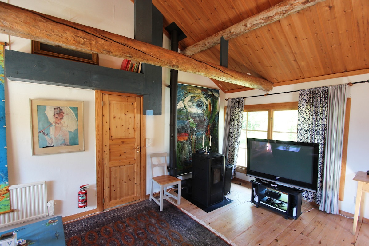 Casa de madera completamente amueblada (con cómoda cama tamaño king, estufa de leña, espacio abierto con dos colchones individuales) situada en una granja de cría de caballos en la hermosa Hälsingland sueca. (Ljusdal) Bañera de hidromasaje disponible. (Precio de alquiler no incluido). El precio incluye toallas, sábanas, ropa de cocina y leña para la chimenea.