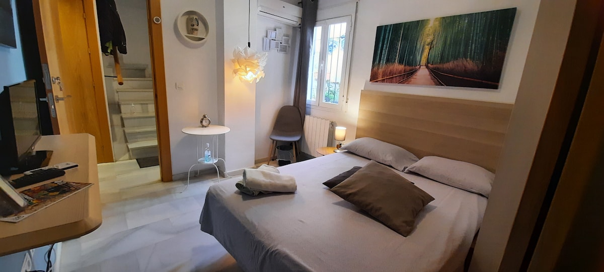 Loft nuevo en el centro Granada, desde donde poder pasear para descubrir la ciudad. Es un concepto abierto en planta baja de una casa catalogada. Tiene 4 ventanales que aportan gran luminosidad, el cuarto de baño está dividido en dos estancias separadas -wc con lavabo/ducha-, cocina abierta, tv con Netflix, gran armario y cama de matrimonio confortable. Cuenta con espacio para trabajar. Se encuentra en una calle peatonal, en el corazón del Realejo, a los pies de la Alhambra.