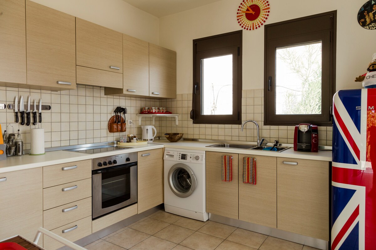 Villa de 220 metros cuadrados, frente al mar (a 100 metros del mar cristalino), un encantador jardín, 3 dormitorios, 2 baños, sala de estar, una cocina totalmente equipada, aire acondicionado en todas las habitaciones, incluido el patio al aire libre con una mesa de billar, una mesa de ping pong y un juego de dardos. Luminoso con mucha luz natural, frente a una playa agradable, tranquila y casi privada. ¡Vista al mar desde toda la villa! Perfecto para familiares y amigos que quieren disfrutar de la vida de verano en uno de los lugares más hermosos de Rodas.