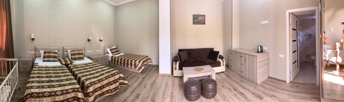 Habitación luminosa y espaciosa con dos camas tamaño queen, perfecta para familias o amigos. Tiene capacidad para un máximo de 4 huéspedes. Incluye baño privado con bañera, balcón con asientos, conexión Wi-Fi gratuita, TV, caja fuerte, mininevera, hervidor eléctrico con café y té. Se proporcionan toallas, sábanas, batas de baño y artículos de tocador. Cocina pequeña compartida y espacio de coworking. Ubicado en la calle Nikoloz Kipshidze en el centro de Vake. Check-in y check-out sin contacto para una estadía sin contratiempos.