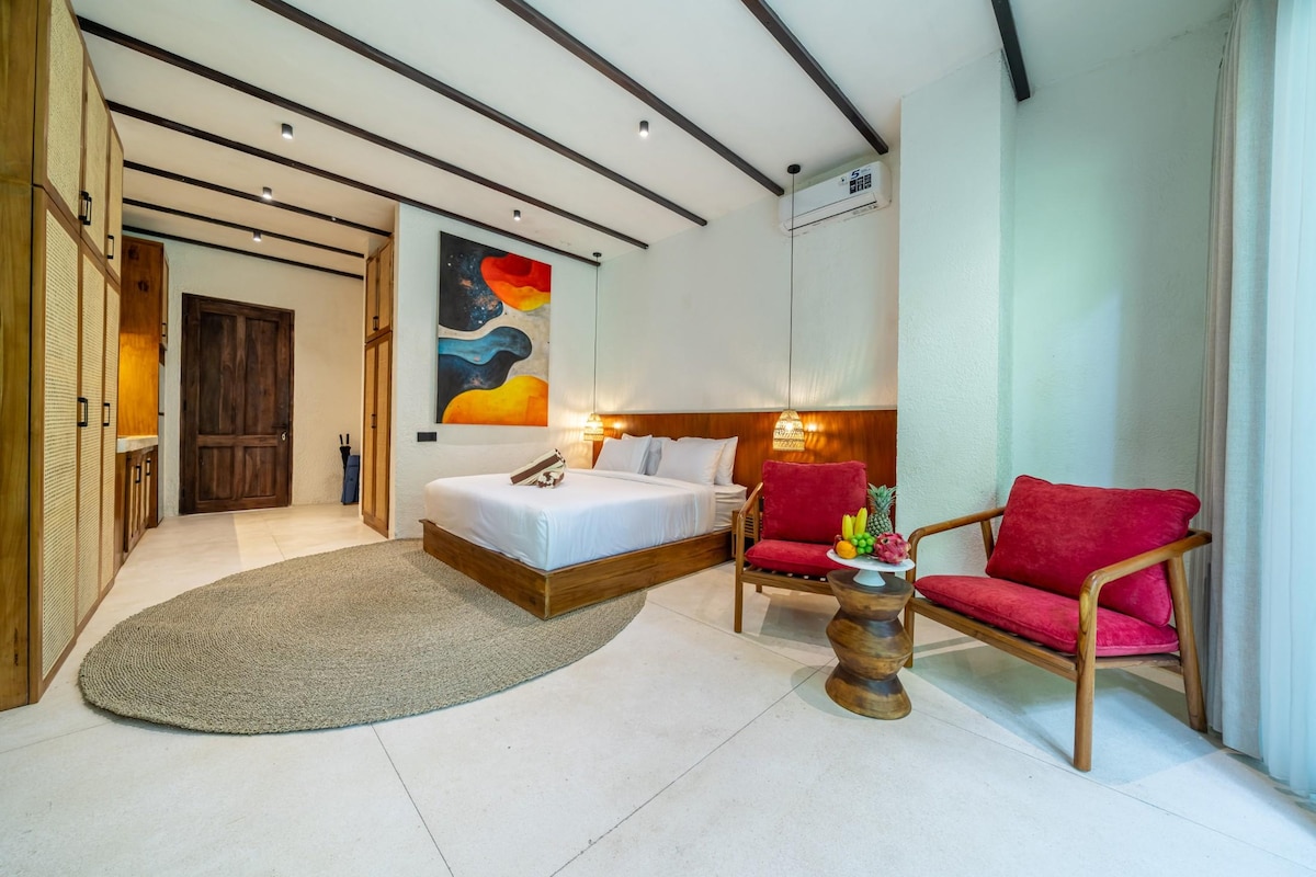 Moderno estudio en el primer piso en el tranquilo Sayan, a pocos minutos de las principales atracciones de Ubud: • Cama tamaño king y baño privado con ducha. • Cocina pequeña con estufa, microondas, nevera, cafetera, hervidor y utensilios de cocina; • Televisor inteligente (55 pulgadas) con streaming y wifi rápido (100 Mbps). • Lavadora para estadías largas. • Piscina compartida, terraza y vistas a la selva. • Servicio de conserjería para excursiones y actividades.
