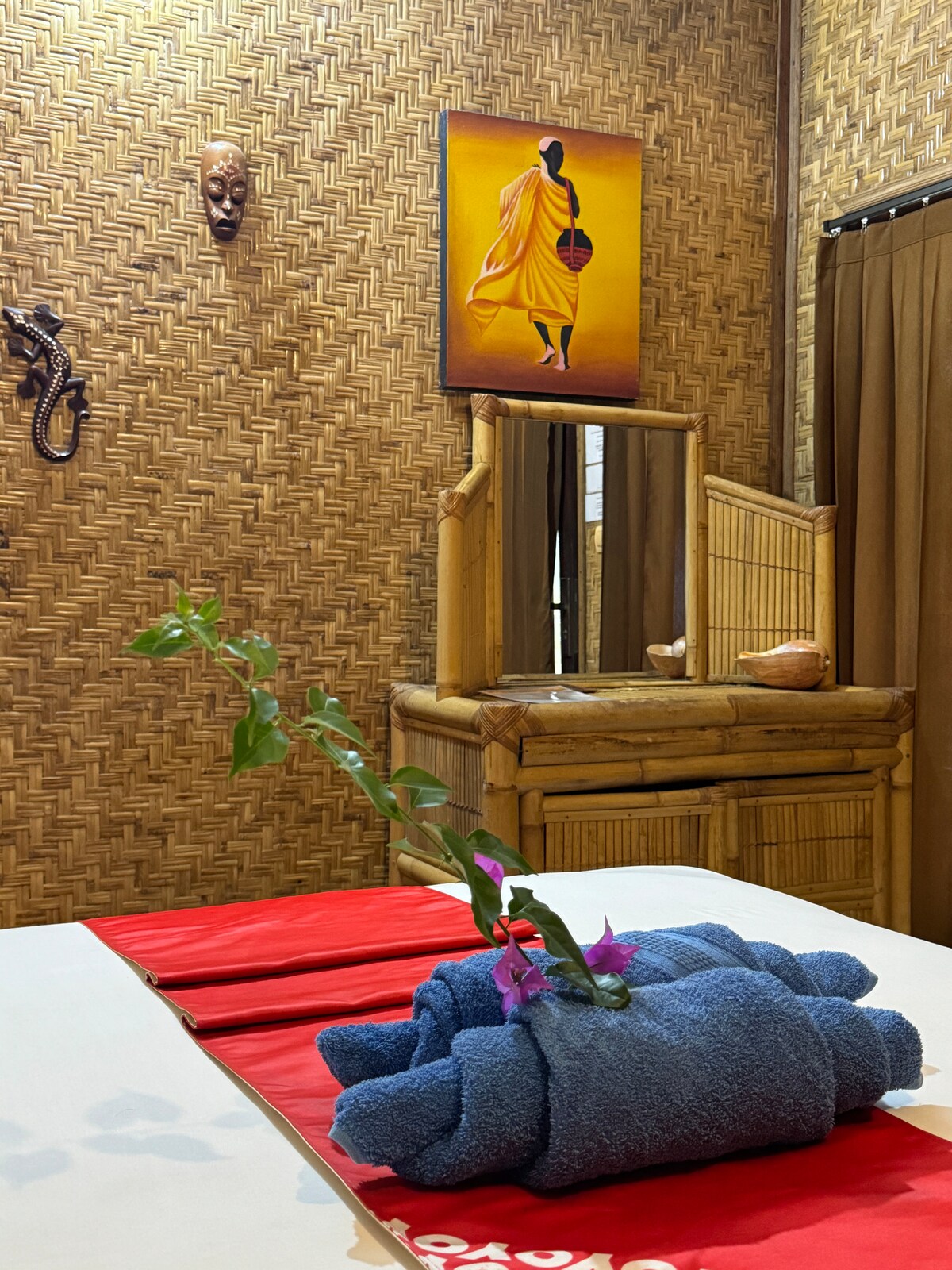 Este encantador bungalow 🏡 cuenta con una ducha tropical al aire libre fría y caliente con fuerte presión de agua y aire acondicionado confiable ❄️. Una cama tamaño king y un tocador 🪞. Wifi rápido (45 Mbit/s), desayuno bufé🍳🥞, una acogedora terraza. A 50 m del espacio de coworking, que se puede transformar en un cine al aire libre🎥🍿. Relájate en la hamaca con vistas a las palmeras y al jardín tropical 🌴🌺. Limpieza diaria. 🧹 Toallas frescas bajo petición🧺. Consejos sobre 🤿 lugares, cafeterías y atardeceres🌅. Personal siempre en el sitio ℹ️