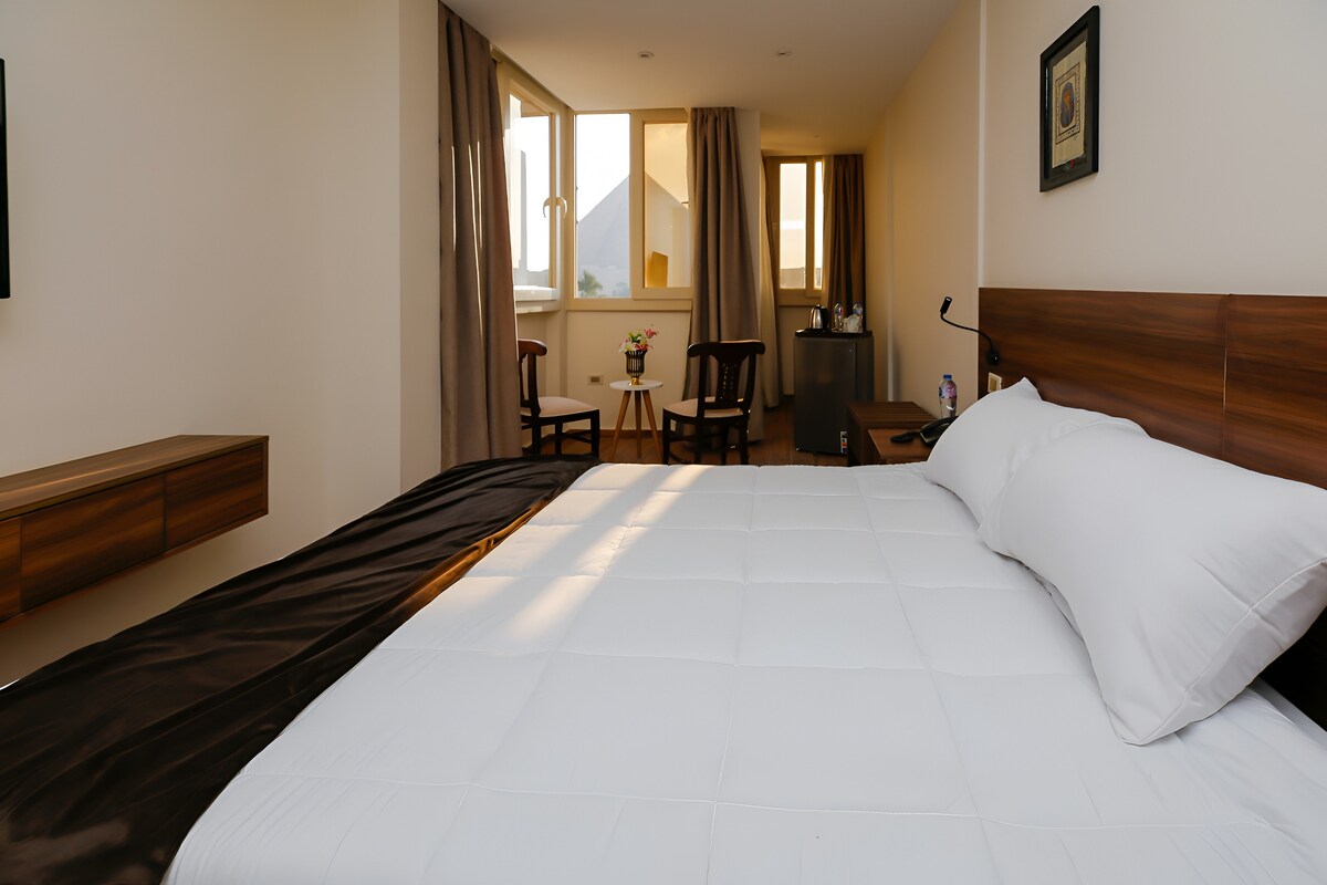 Disfruta de tu estancia en nuestra cómoda habitación doble con dos camas, balcón privado y vista parcial a las famosas Pirámides. Perfecta para amigos o familia, esta habitación ofrece un ambiente relajante con comodidades modernas, permitiéndote desconectar mientras disfrutas un toque de historia desde el balcón.