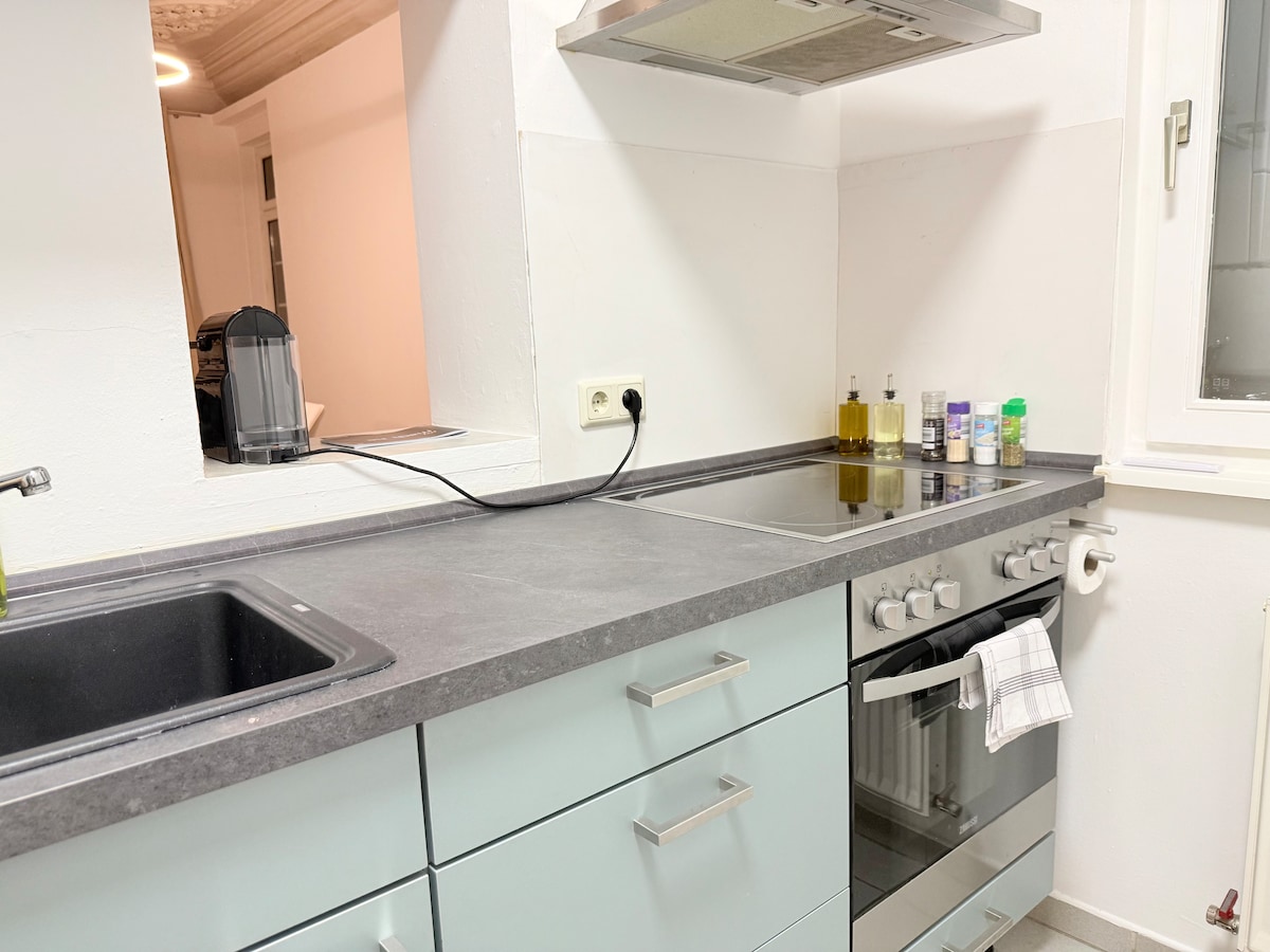 Apartamento de diseño abierto. En la planta baja del apartamento: cocina, baño, aseo separado, así como comedor y sala de estar. La primera planta del apartamento es un ático convertido, aquí pueden dormir hasta 6 personas en total. ¡Un colchón en el suelo (1,40 m de ancho) y 4 camas individuales en una habitación abierta! (¡El acceso al colchón es estrecho y profundo!) Dado que el apartamento se encuentra 2 plantas por encima de un restaurante, es posible que de vez en cuando la música llegue al apartamento. Esto suele ser solo los fines de semana.