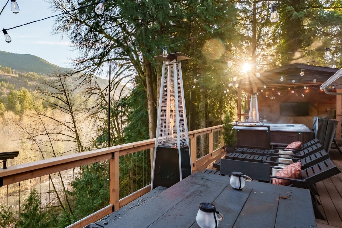 ¡Vistas a la montaña Lux River! Sala de juegos, jacuzzi, fogatas.
