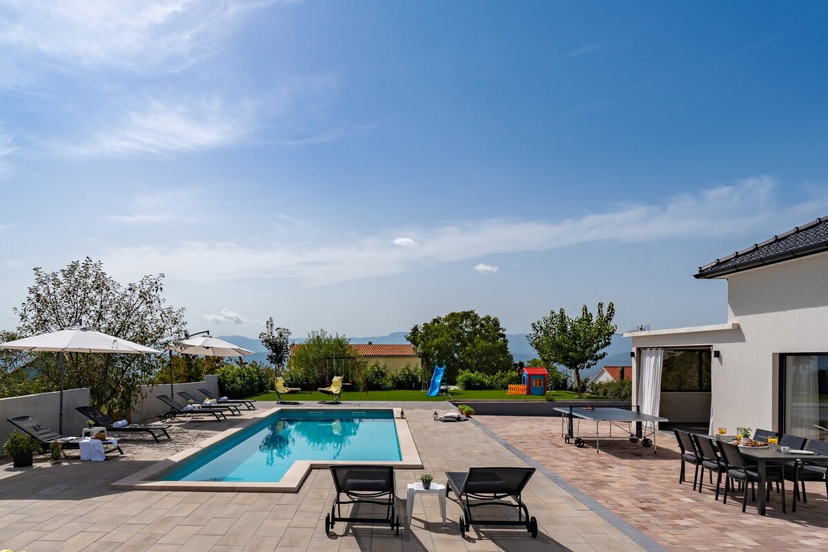 Una espaciosa casa familiar junto a la piscina con vistas al paisaje ondulado. Se encuentra en Glavina Donja, no muy lejos de Imotski. A solo media hora de la playa. Es espacioso e ideal para varias familias o grupos de amigos. Diviértete en la sala de actividades jugando dardos o tenis de mesa o juega al billar, no te aburrirás aquí. Disfruta de las noches de verano en la terraza con barbacoa y refréscate en la piscina detrás de la casa,mientras los niños se divierten en el parque infantil.