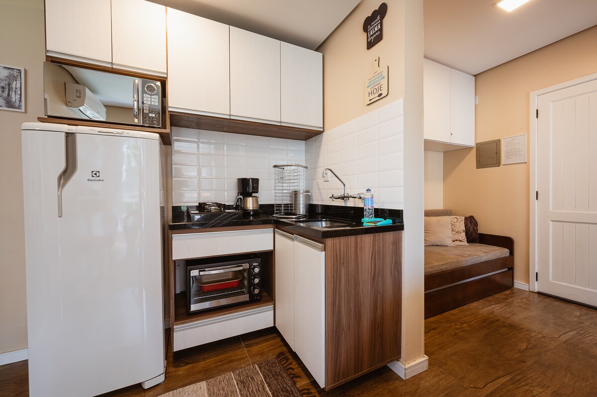 Situado en el centro de la ciudad, nuestro apartamento es una excelente opción de alojamiento en Gramado. La unidad tiene 1 dormitorio que contiene una cama doble y también un sofá cama en la sala de estar. Estufa, microondas, horno, refrigerador y otros utensilios para toda la comodidad durante tu estancia. Ofrecemos: Wi-Fi, TV inteligente y aire acondicionado en el dormitorio y la sala. No hay lavadora. Estamos a solo 900 m de Rua Coberta (a unos 15 minutos a pie). Garaje disponible con reserva. ¡RESERVA AHORA!