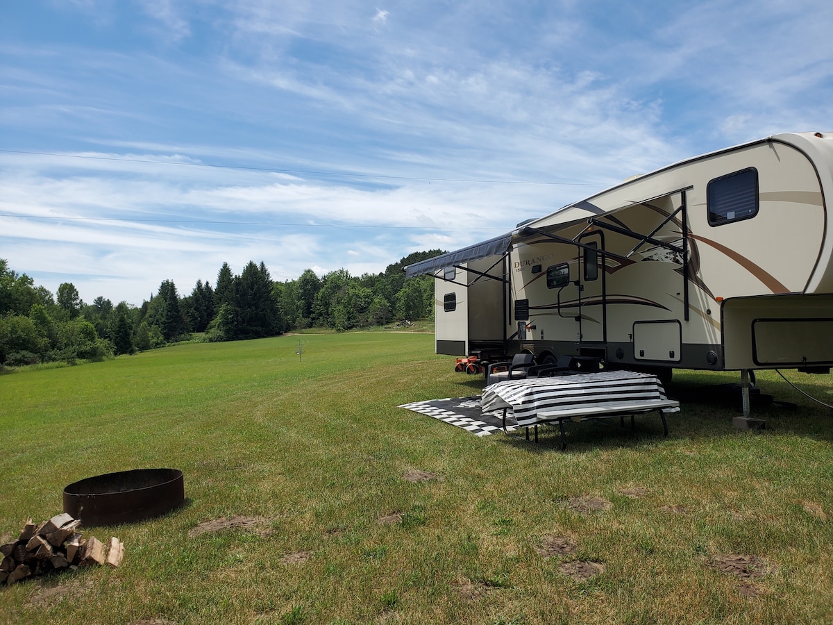 Una quinta rueda de 36' ubicada en nuestra propiedad RURAL en Williamsburg, a 10 millas de la frontera de Traverse City. La unidad está a 100 PIES de nuestra casa. Cuenta con sala de estar/comedor/cocina/baño/dormitorio/tanque de agua caliente de 12 galones/fogata/mesa de picnic/silla doble Adirondack. CONDUCIRÁS POR 1/4 DE MILLAS DE CAMINO DE TIERRA justo antes de llegar, mantenido SOLO por la Comisión de Carreteras del Condado. Solo adultos, NO SE ADMITEN MASCOTAS, no se puede fumar. Los huéspedes que disfruten estando en una zona remota apreciarán lo que tenemos para ofrecer.