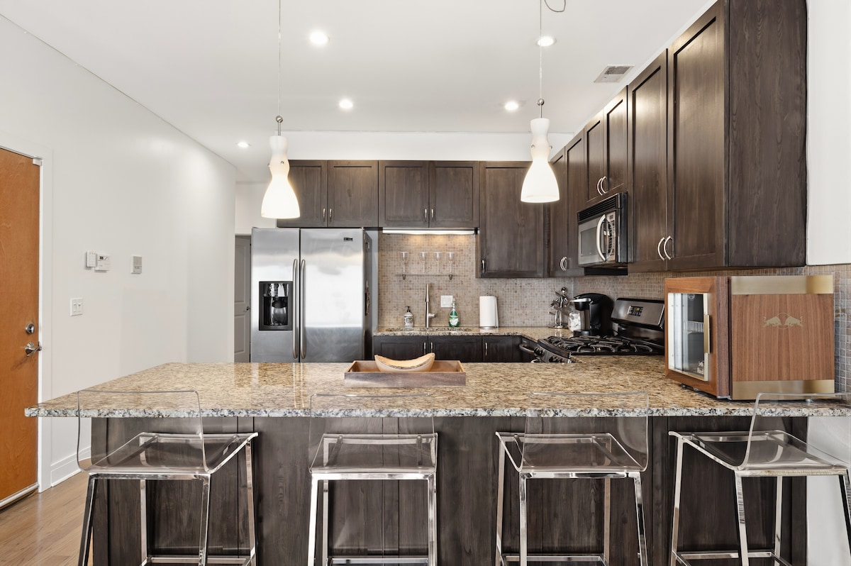Un hermoso y moderno apartamento de 2450 pies cuadrados con una terraza privada en la azotea, un fogón en la azotea, un patio privado adicional y un patio, electrodomésticos nuevos y un interior amplio y luminoso. Aparcamiento privado gratuito en las instalaciones (1 plaza de garaje y una plaza en la entrada) en el corazón de Chicago y a pocas manzanas a pie del sistema de tránsito L, que proporciona un fácil acceso tanto al centro de la ciudad, como a la zona metropolitana de Chicago y a los dos principales aeropuertos.