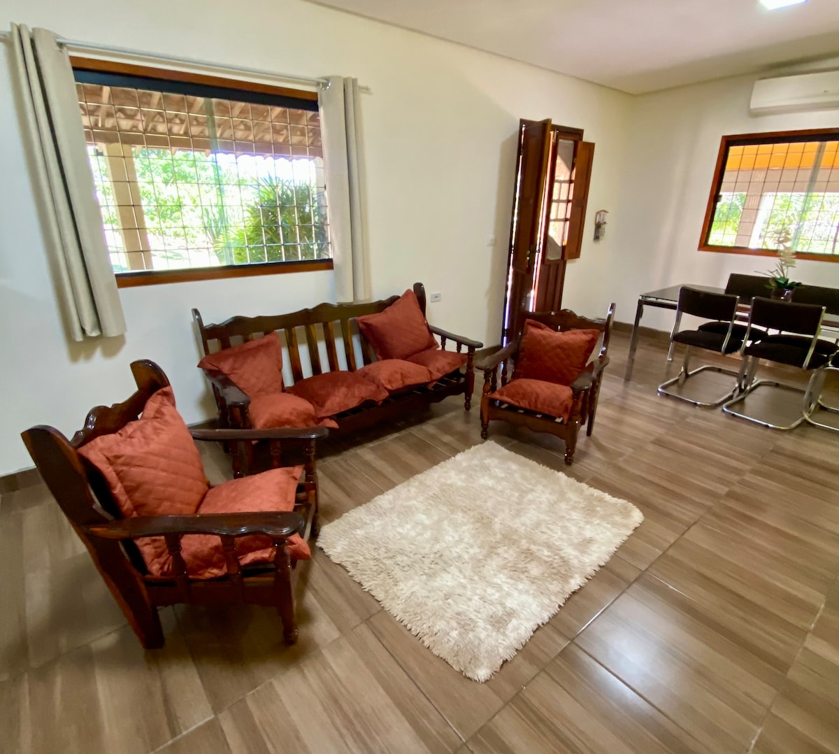 Casa fuera del condominio, en un terreno tranquilo y privado, donde el huésped, su familia y sus amigos podrán descansar, disfrutar, divertirse y contemplar una hermosa puesta de sol en medio de nuestro jardín, ¡sin restricciones de horario ni de ruido! Área de más de 2,000 metros cuadrados, con una casa familiar construida, estacionamiento para 5 automóviles, dormitorios y sala de estar con aire acondicionado, barbacoa y ducha al aire libre, aparatos para fondue y raclette, vasos, vistas al valle y, sobre todo, ¡fácil acceso!