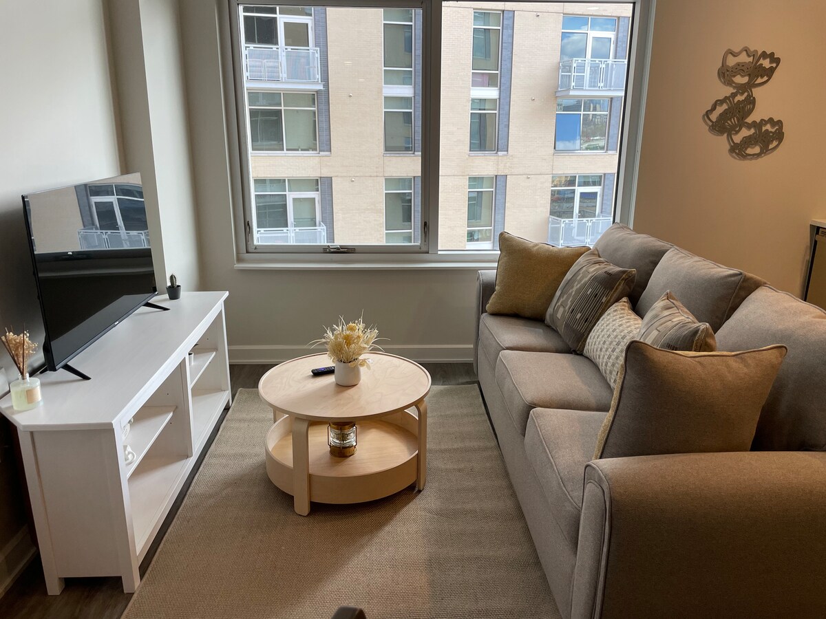 Disfruta de la comodidad moderna en el corazón de Tysons. Este acogedor y elegante estudio cuenta con una cama tamaño queen, acabados elegantes y ventanas del piso al techo que llenan el espacio con luz natural. Disfruta de una cocina totalmente equipada, una relajante sala de estar y un baño privado impecable. Ubicado a pocos pasos del centro comercial Tysons Corner y a poca distancia a pie del metro, es el lugar ideal para viajeros de negocios, escapadas de fin de semana y cualquier persona que desee una estancia cómoda y céntrica.