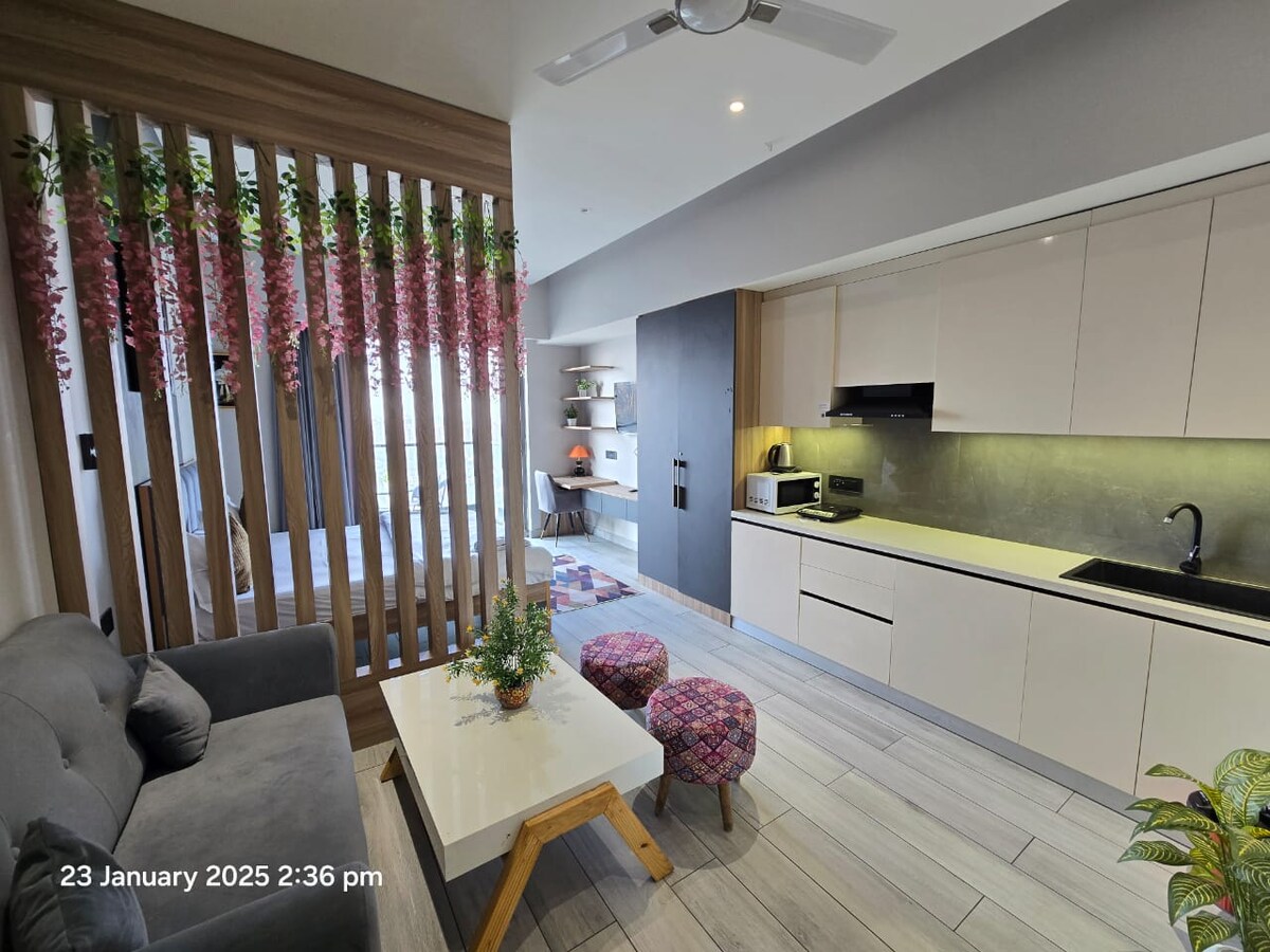 Lujoso e independiente apartamento estudio de 1bhk totalmente equipado, con todos los servicios modernos, apto para parejas, ubicado en el centro, fantástico vista nocturna desde el piso 20. Disfruta tu Preciosa estadía sin ningún tipo de ajetreo. Check-in en el estante y entrega de alimentos a la puerta de Zomato y Swiggy. Este apartamento se encuentra dentro del área del centro comercial, dentro de las instalaciones: cine estadounidense en el quinto piso, gimnasio dorado en el cuarto piso, todo el gran punto de venta de comida en la planta baja, zona de juegos para niños, más supermercado para comestibles y muchos más.