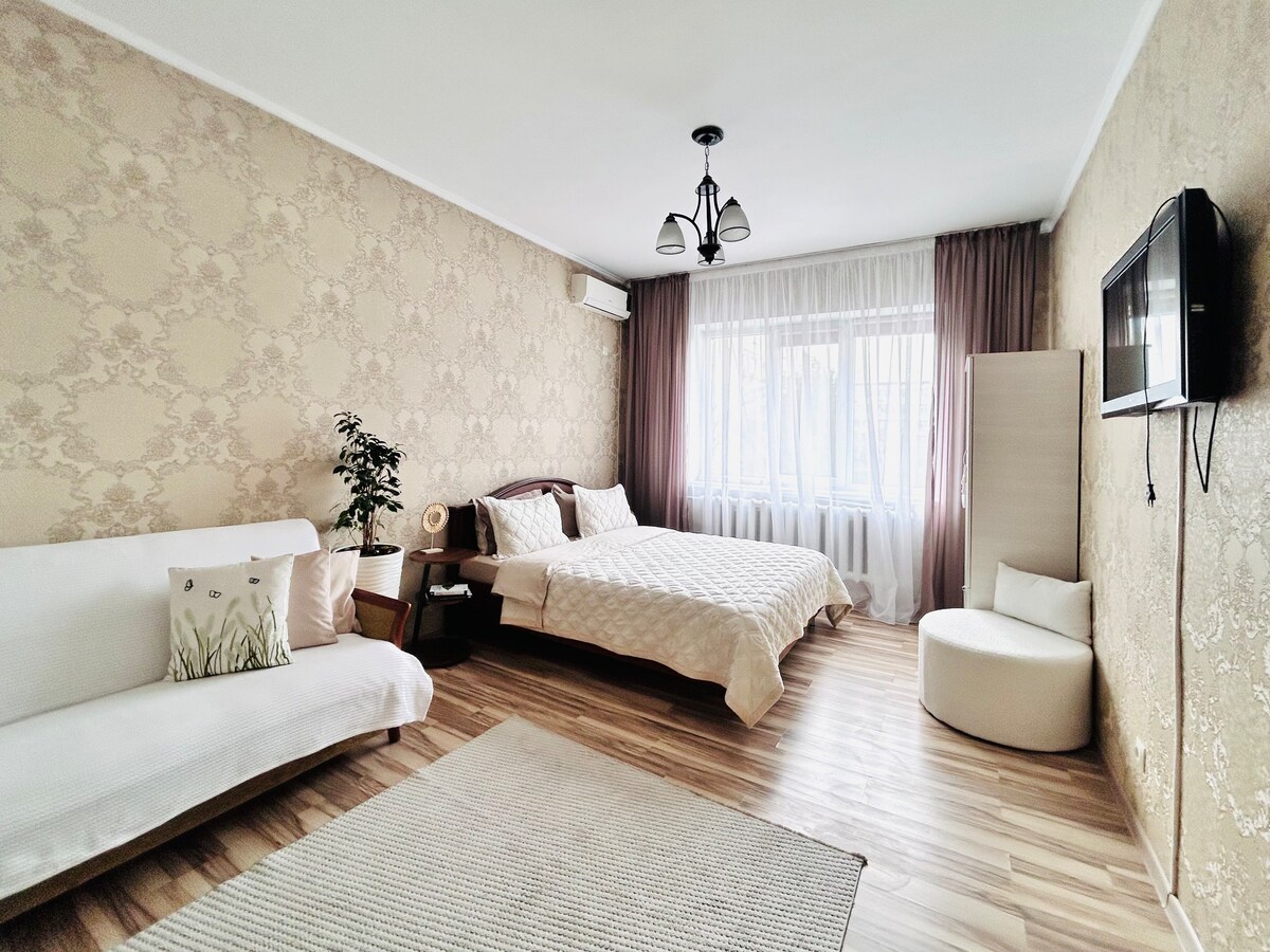 La mejor ubicación para sentir el ambiente de Almaty. ¡El mismo centro donde todo está a poca distancia a pie! Cerca del centro comercial, cafeterías, cines, parque de 28 Panfilov, parque Gorky, zoológico, Green Bazar, sinfonía, ópera, etc. Las comodidades: lavavajillas, lavadora, cafetera, aire acondicionado, TV, 2 proveedores de Internet Kazaktelecom 500mb y AlmaTV 100mb, plancha y CERRADURA INTELIGENTE. Se proporcionan toallas y accesorios de ducha para todos los huéspedes.