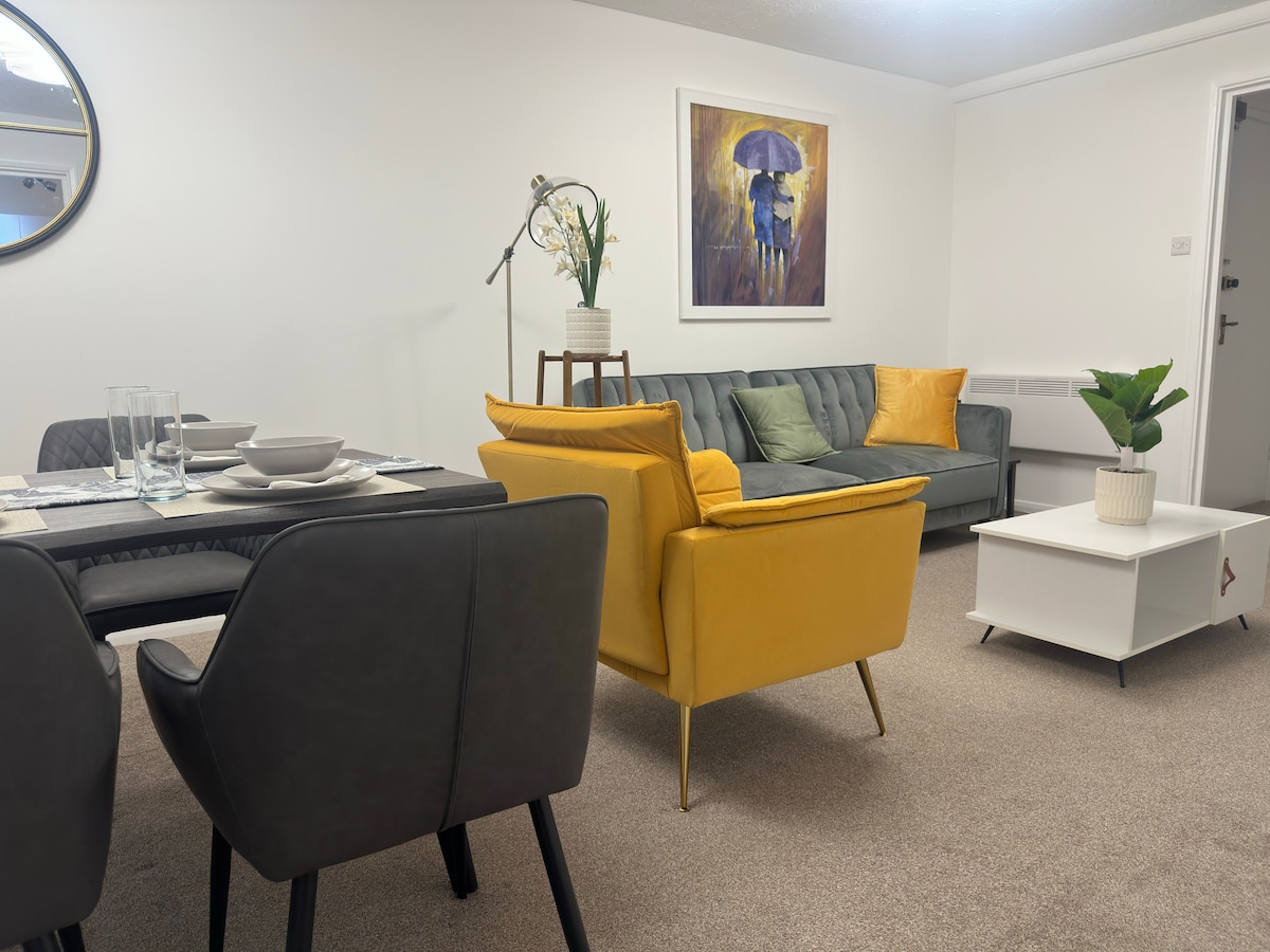 Elegante apartamento de 2 dormitorios en la tranquila Stone, a pocos pasos de la estación de Stone Crossing y a 5 minutos de Bluewater. Disfruta de interiores modernos, una cocina totalmente equipada, estacionamiento dedicado y Wi-Fi rápido. Perfecto para estancias de negocios o de placer con acceso rápido a Londres y servicios locales. Tranquilo, seguro y bellamente diseñado: tu hogar ideal lejos de casa.