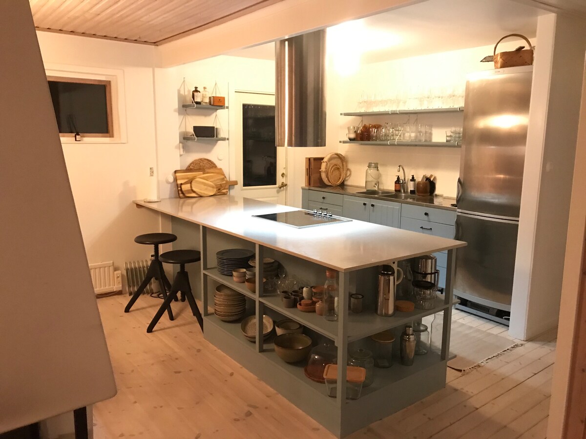 -Skärgårdsvilla en un entorno impresionante de 1922 ubicado justo al borde del agua. - Jacuzzi para nadar al atardecer, - Sol desde la mañana hasta la noche y solárium de 300 metros cuadrados. - Hermosa casa de campo en el lago con gran cama doble. - Un encantador entorno de salón bajo techo con cocina al aire libre y barbacoa. - El muelle junto al lago es perfecto para comenzar el día nadando en el lago y café por la mañana. -2 kayaks, bote de REMO y tabla de surf de remo están disponibles si quieres salir al agua. - Wifi rápido y TV LED de 65 pulgadas con paquete de TV grande. Roble de 400 años en el jardín