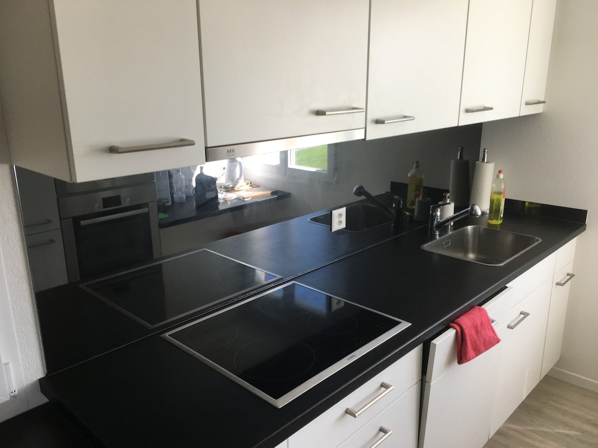 El pequeño loft está en la planta baja de una casa señorial. Es moderno y está cómodamente amueblado: baño elegante en negro y latón, paredes de yeso de cal blanca, piso de hormigón de diseño con calefacción, muchas ventanas, acceso directo al jardín. La habitación inundada de luz, la tranquilidad y el jardín te invitan a relajarte. Las vistas de las colinas y los Alpes te hacen querer caminar y andar en bicicleta. La estación de tren y la plaza del pueblo con restaurantes y una tienda de comestibles están a solo unos pasos (4 minutos).