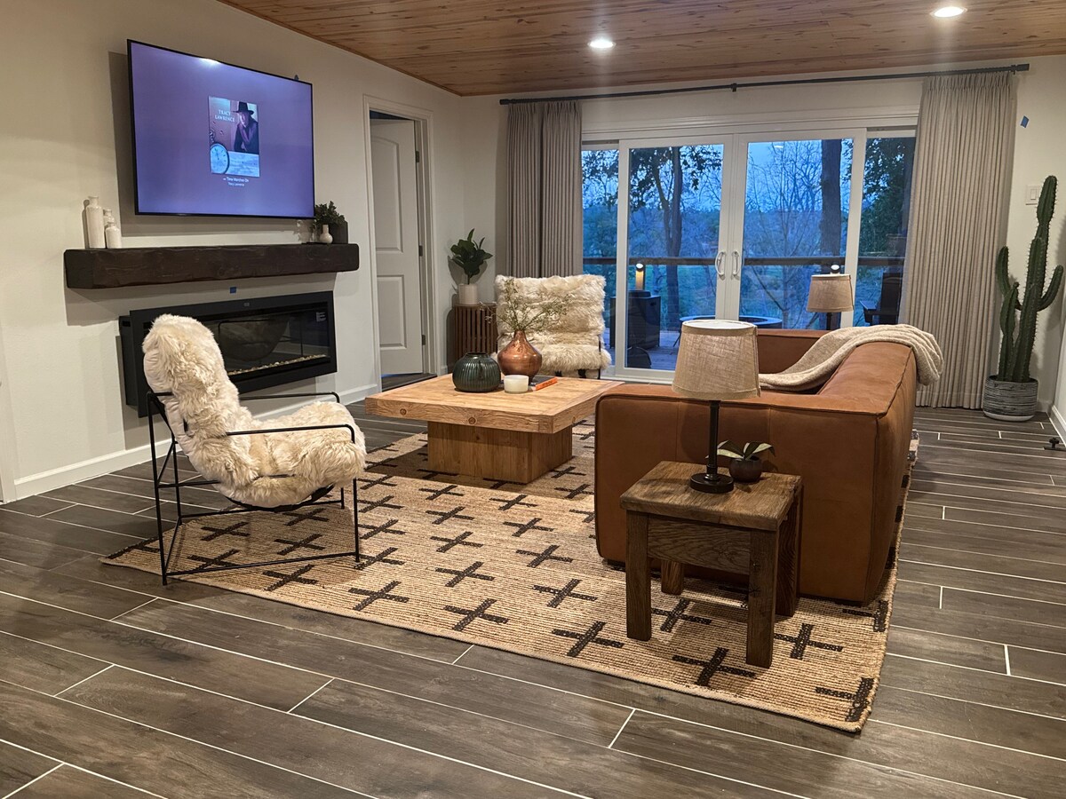 ¡Relaja todas tus preocupaciones! Este elegante y romántico escondite con vistas al lago es el lugar perfecto para renovarse, recargar energías y disfrutar de vistas perfectas. Esta cabaña única ofrece una sala de spa, amplias terrazas, una acogedora sala de estar con chimenea, comedor al aire libre, ducha al aire libre, barbacoa, TV y zona de juegos. La propiedad está convenientemente ubicada a 2 minutos del lago y de la rampa para botes n.º 1. A 5 minutos de restaurantes, tiendas de antigüedades, a 10 minutos del viñedo local, a 20 minutos de la encantadora ciudad de Gruene y New Braunfels.