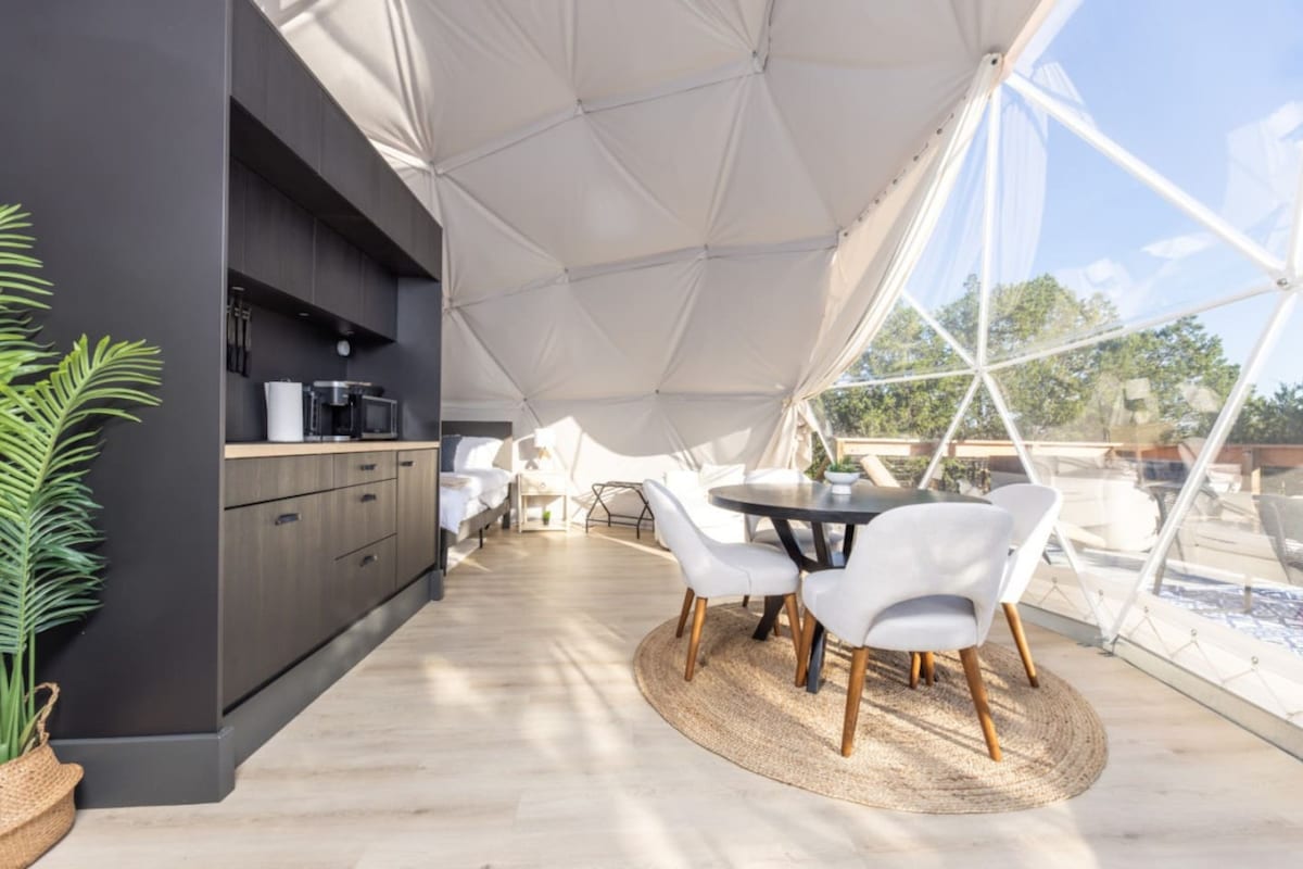 ¡Te damos la bienvenida a nuestro encantador refugio con forma de cúpula en Fredericksburg! Disfrute de la elegancia romántica en este refugio de 3 estrellas A3, que cuenta con una cama tamaño king y una lujosa bañera. Despierta con mañanas serenas en el patio privado, explora las bodegas cercanas y relájate con estilo. Con vistas panorámicas y amenidades bien pensadas, este acogedor refugio promete una combinación perfecta de relajación y aventura. ¡Reserva ahora para disfrutar de una experiencia íntima en Texas Hill Country!
