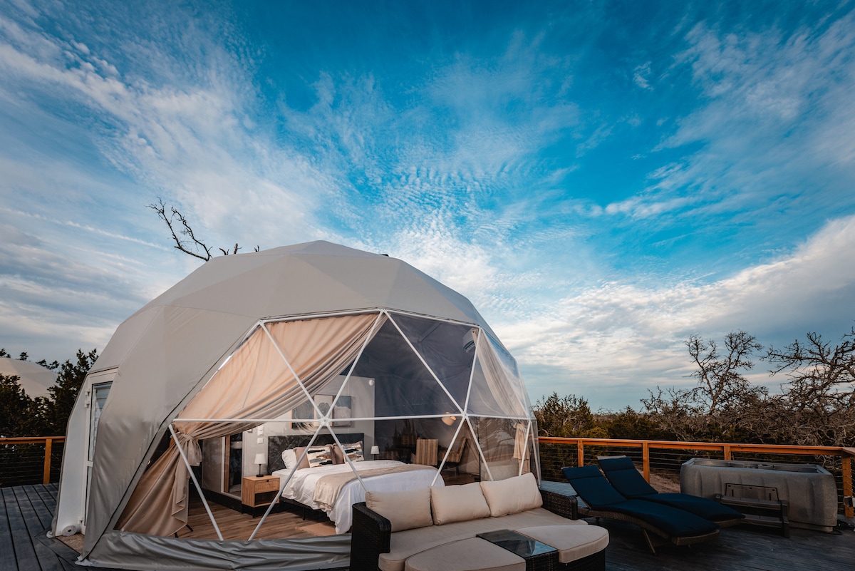 ¡Ven y disfruta de unas vistas increíbles mientras haces glamping en Hill Country, Texas! El Hill Country Dome se encuentra en 11 acres de paz, tranquilidad y privacidad. Disfruta de una amplia terraza con jacuzzi, mesa y sillas y parrilla. A solo unos pasos, disfruta del atardecer en tu propia chimenea privada.