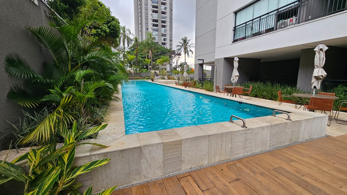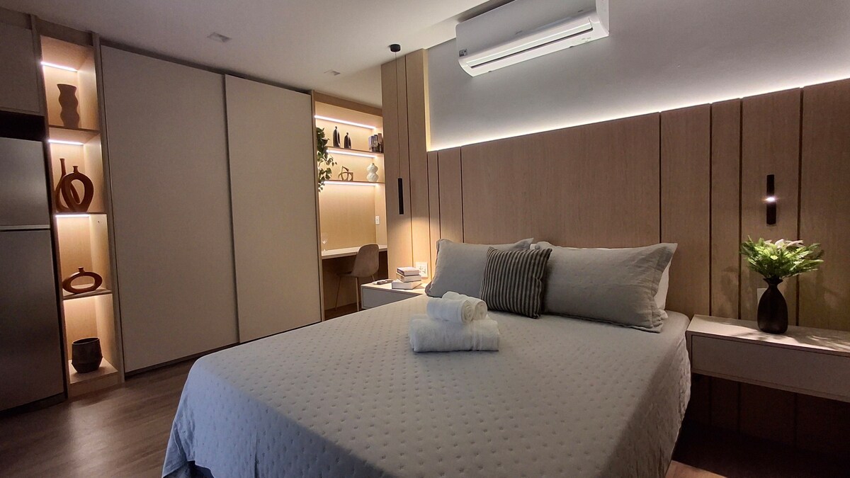 Aquí encontrarás un lugar acogedor, agradable vista y muy bien ubicado. Tiene: * 1 cama tamaño queen, 1 sofá cama doble y 1 colchón * Aire acondicionado, TV inteligente, wifi y cortina opaca. * Cocina completa: cocina de inducción, horno eléctrico, microondas, cafetera de cápsulas y utensilios. * Ajuar de calidad, mantas para todos * Parrilla en el balcón (uso opcional con una tarifa de limpieza de R$100) * En el condominio: piscina con bungalow, gimnasio, lavandería, mercado 24 horas y conserje 24 horas