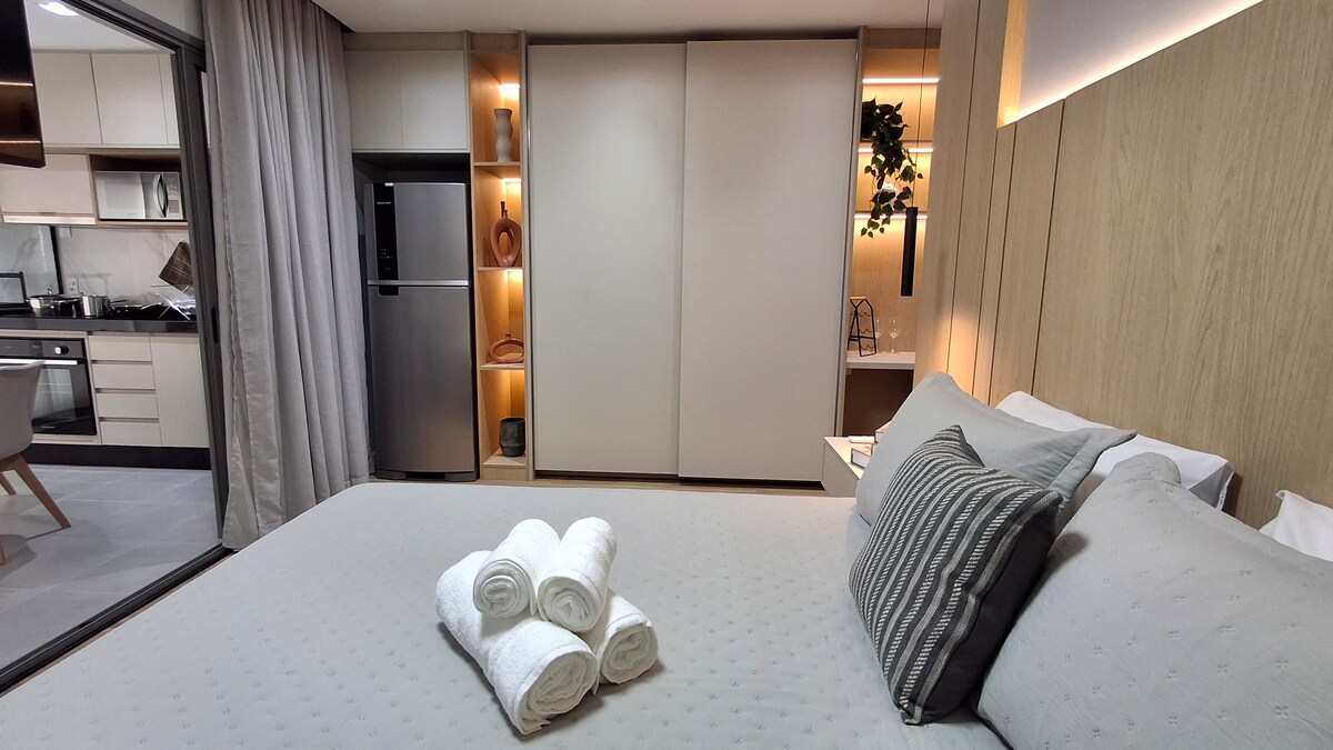 Estudio de alta gama en Gran Maia Giardino / Guarulhos. Ideal para estadías cortas o largas. Capacidad para 4 personas, con una cama tamaño queen y 2 camas individuales. Cocina totalmente equipada con zona de parrilla y aire acondicionado. Condominio con piscina, gimnasio, parque infantil, ludoteca, lavandería, espacio para mascotas, tienda de comestibles y estacionamiento con seguridad y conserje las 24 horas. Ubicación privilegiada, fácil acceso a las principales vías de la ciudad, a 7 km del aeropuerto GRU y cerca del mercado, centros comerciales, farmacias y restaurantes.