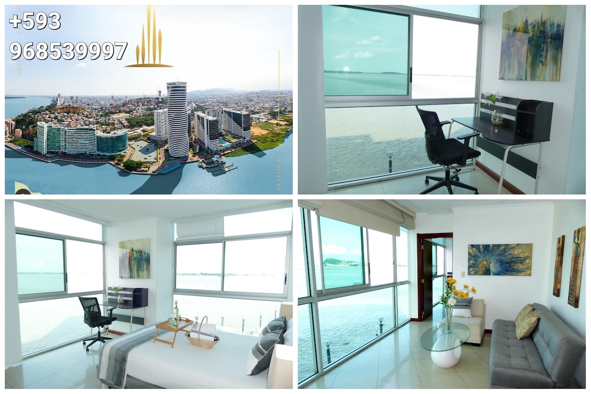 Ecusuites +593_96853 9997. +593_939176452 Exclusiva Suite Penthouse jacuzzi privado con Increíble vista al Río Guayas. ⭐️ Full amoblado, Edificio Riverfront II, Puerto Santa Ana junto Hotel Wyndham, a 3 minutos Aeropuerto. Ubicacion en sector Turístico cerca Malecón 2000 y Las Peñas. Departamento con magnífica vista panorámica al Río, ubicación privilegiada que hará inolvidable su estancia. Cama queen 2.5" , 1 Sofá cama, baño agua caliente, sala comedor, cocina full equipada, A/C.