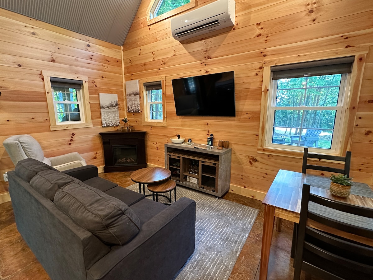 Ven a visitar nuestra limpia y acogedora cabaña de un dormitorio en las boscosas colinas del condado de Guernsey, Ohio, y relájate en la espaciosa terraza y escucha los sonidos de la naturaleza, da un paseo por la propiedad de 19 acres o quédate dentro y pídele a Alexa que reproduzca tus canciones favoritas o transmita una película de éxito en el televisor 4k UHD de 65 pulgadas con sonido envolvente Dolby Atmos 7.2.4, tú eliges.