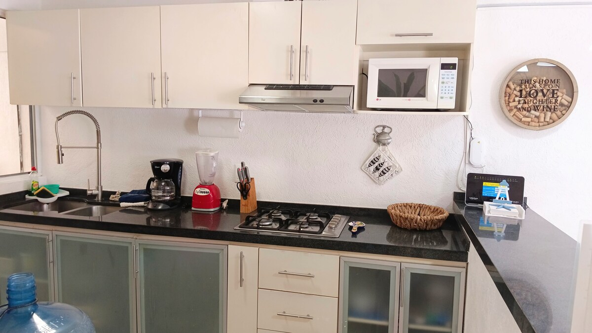 Cómodo bonito y muy limpio. Disfruta de estar en planta baja con acceso directo a la Alberca o jacuzzi desde tu terraza. Equipado con todo lo necesario para que no tengas preocupaciones durante tu estancia *wifi -Starlink satelital * 2 tv’s con Roku y una con canales abiertos HD *sabanas y almohadas de calidad. * estacionamiento propio * electrodomésticos, platos, vasos, satenes, licuadora tostador, cafetera, etc. *atención personal * limpio y fresco te esperamos!😀