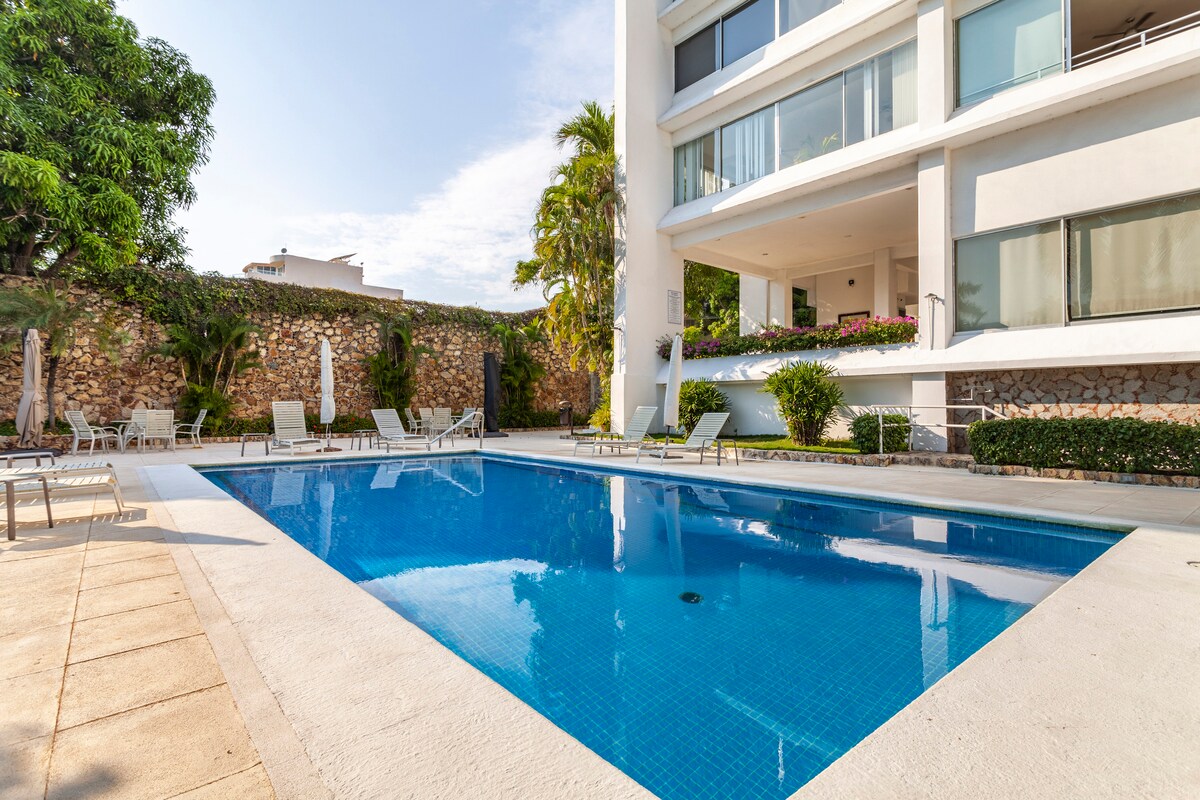 Departamento tipo estudio bien equipado; muy cómodo con 2 camas matrimoniales y 1 sofá cama. Cuenta con Aire Acondicionado, wifi, Internet, tv por cable, Lavadora, Plancha, Cocina Equipada con microondas, Licuadora y Cafetera El edificio tiene Alberca, Jacuzzi, Área de juegos, Elevadores, Vigilancia 24 horas, Estacionamiento gratuito. Rodeado de Centros Comerciales, Restaurantes, Bares. Zona segura y Tranquila, Atraviesa la calle y disfruta la mejor playa de Acapulco y una vista espectacular.