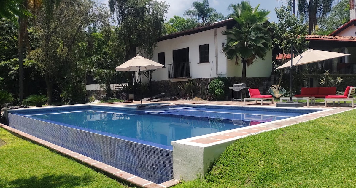 Hermosa casa sola para descansar y convivir en familia disfrutando el mejor clima de Morelos. A la entrada del pueblo de San Gaspar. Todos los servicios y a minutos de los principales salones de eventos sociales y club de golf Hacienda San Gaspar. 4 habitaciones , sala, comedor, cocina equipada y 2 baños completos dentro de la casa. Alberca climatizada (opcional), asador y baño completo para uso exterior. Estacionamiento 2 autos. WI-FI, Tv Cable. Hasta 10 personas. Fin de semana/ semana completa