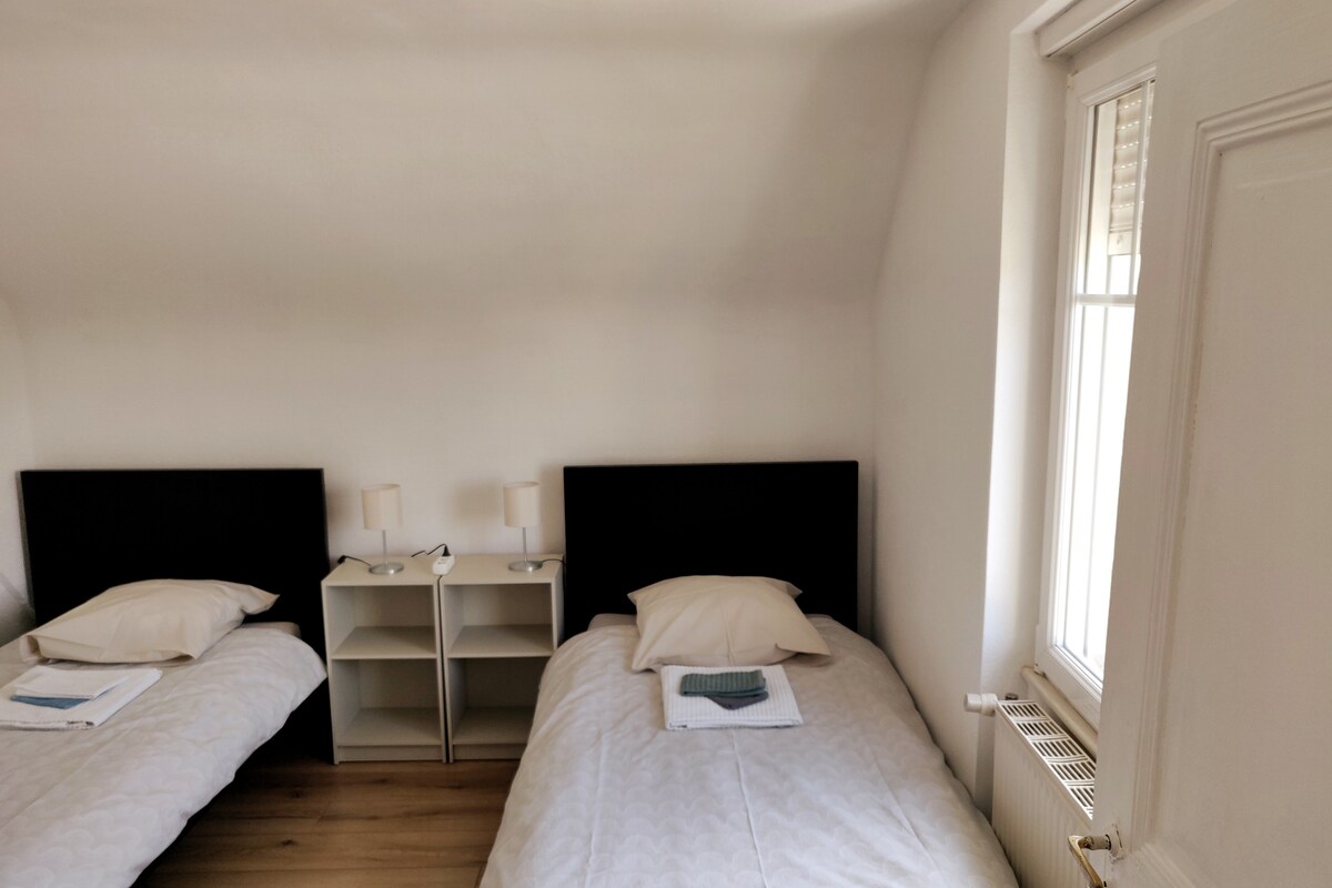 Bajo el techo, espacio amplio, luminoso, tranquilo e independiente en el segundo piso de una casa con carácter. Dos grandes ventanas de techo te ofrecen unas vistas inmejorables de los Vosgos. El alquiler incluye la habitación principal, un dormitorio contiguo con una cama doble, un baño, una pequeña cocina y un altillo con 2 colchones colocados sobre tatamis. La restauración se ha realizado con materiales ecológicos... ¡y con mucho cuidado y cariño! ¡Tiene acceso al jardín a su antojo!
