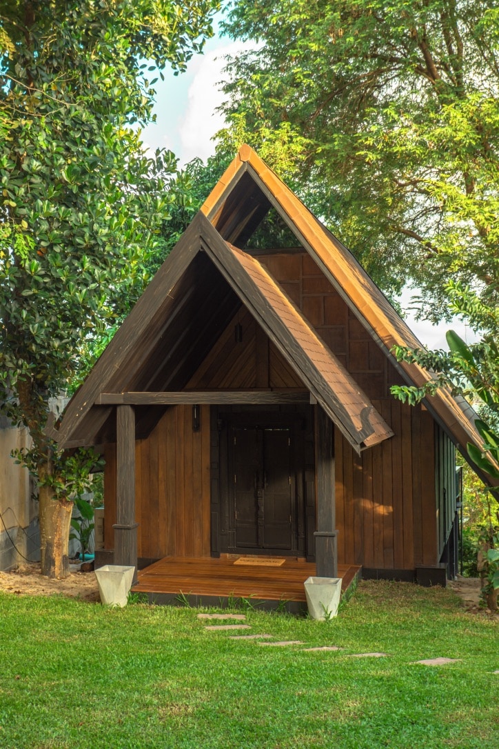 Tenemos 2 bungalows de bambú ecológico casi idénticos en un refugio ecológico aislado por un tranquilo sendero para pies enclavado en un jardín tropical con una hermosa vista al mar. Este bungalow único de A-frame está hecho casi en su totalidad de bambú y madera y lo más cerca posible de vivir en la naturaleza. Es un diseño sencillo, minimalista, pero elegante para parejas o viajeros individuales que quieran tener y compartir una experiencia de vida natural.