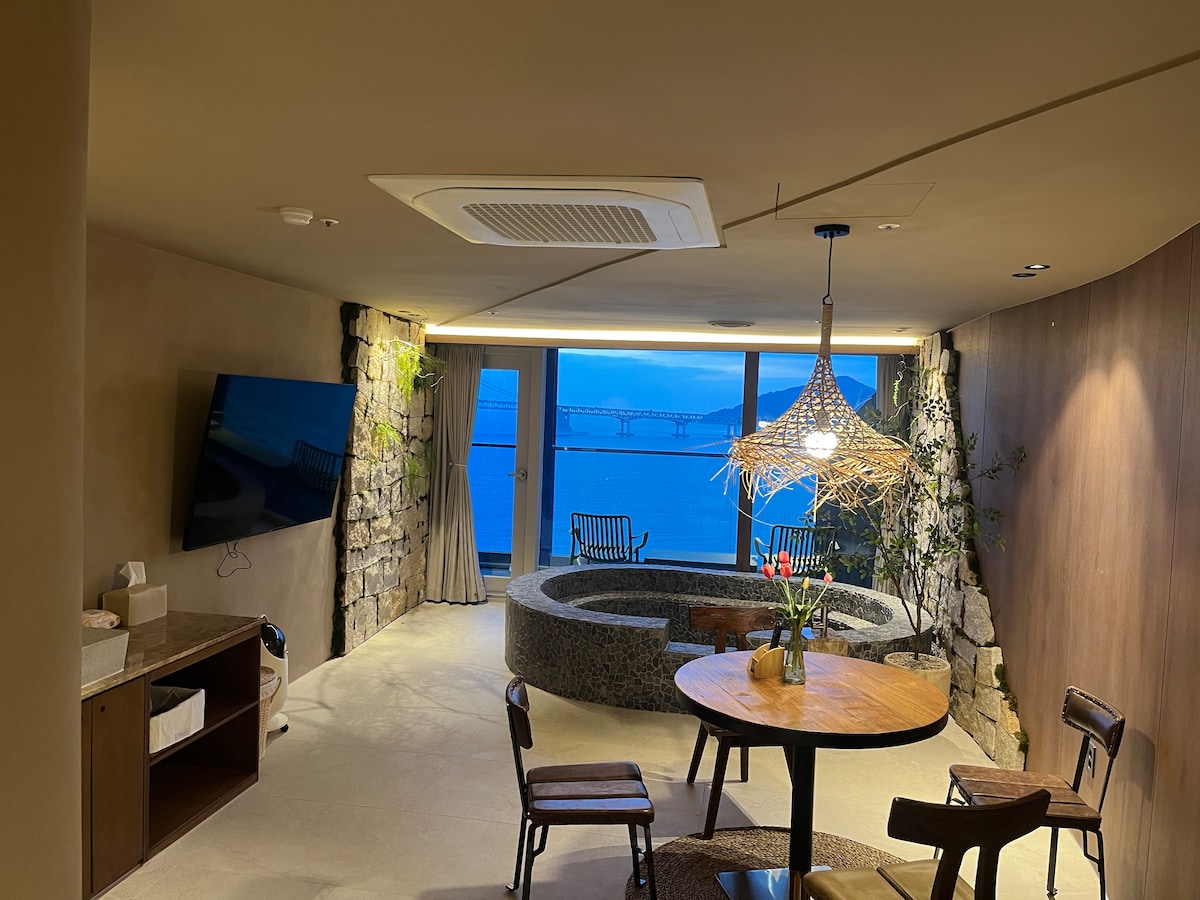 Siente la paz del cielo mientras miras directamente a la vista panorámica del océano de Gwangan Bridge de Jepeur mientras disfrutas de la brisa fresca de Gwangalli. - Interior de lujo - Vista al mar frente al puente de Gwangan, Jacuzzi. - A 30 segundos de la playa. - Uso gratuito de agua caliente Jacuzzi las 24 horas. - Ubicación del alojamiento en el centro de Gwangalli Hot Place. - Alojamiento premium con desinfección de filtro. [Número de personas] Estándar 4 personas / máximo 6 personas [Configuración] Sala de estar + cocina + 2 dormitorios + 2 camas + 1 baño + 1 ducha [Guía de llegada y salida] Entrada- 16:00 / Salida- 11:00 [Cocina] Cafetera, inducción, microondas, nevera Todo tipo de vasos, todo tipo de utensilios [Sala de estar] Jacuzzi grande con vista al mar, mesa de sala de estar, sofá, pantalla de 150 pulgadas, proyector de alta calidad, Dyson Airwrap, sistema de aire acondicionado [Dormitorio] 3 espacios Colchón de lujo, ropa de cama premium [Baño] Amenidades, espuma limpiadora, gel de manos, champú, tratamiento, etc. [Comodidades] Protección de la privacidad con persianas eléctricas en toda la ventana de vidrio frontal Cargador, wifi
