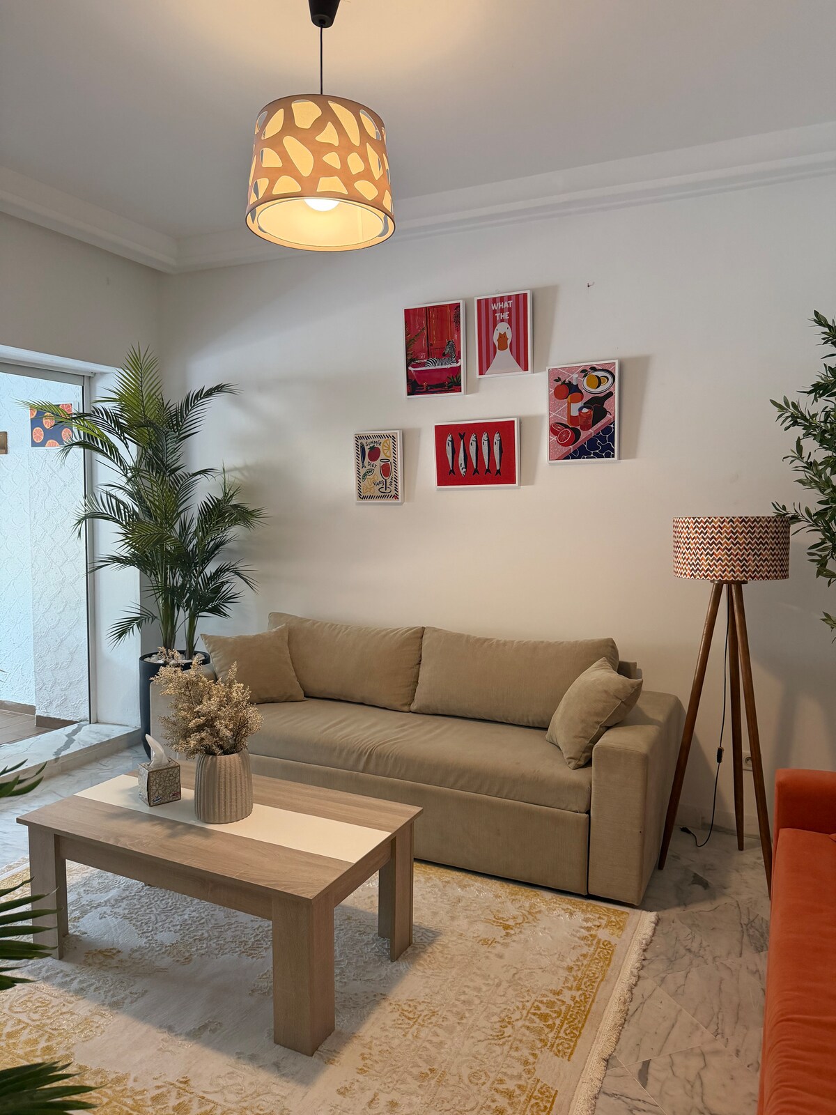 Encantador apartamento acogedor y luminoso, situado en una residencia tranquila y segura, en la zona turística de Sousse, a pocos pasos de la playa y del Puerto El Kantaoui. • Habitación confortable con ropa de cama de calidad • Cocina totalmente equipada (tostadora, hervidor de agua, etc.) • Salón acogedor con TV inteligente y Wi-Fi Ideal para una estadía relajante junto al mar, en pareja o en solitario. Un lugar cálido para disfrutar del sol y el encanto de Sousse.