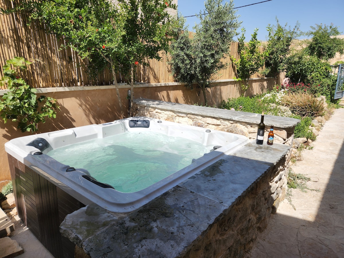 Un lugar único para un momento único... Ubicado frente al Monte Zion, el Zimmer cuenta con un jardín con diferentes áreas de estar. Zona de barbacoa, comedor exterior. El zimmer viene con jacuzzi, cocina equipada y chimenea. Puedes pedirle un desayuno saludable al anfitrión. El Zimmer cuenta con aire acondicionado, zona de estar, TV de pantalla plana con canales por cable, cocina, patio, baño con jacuzzi caliente, batas de baño y pantuflas. Está equipada con ropa de cama y toallas.