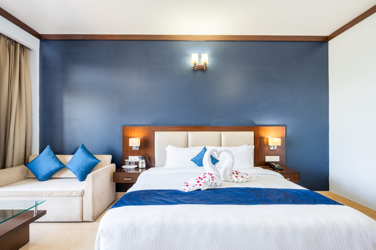 **Habitación Deluxe King | Limpia y cómoda** Una cómoda habitación Deluxe con una cama doble tamaño king, aire acondicionado y un baño privado adjunto. Adecuado para parejas o familias pequeñas, con un colchón adicional disponible bajo petición para un huésped adicional. Incluye wifi de alta velocidad, servicio de limpieza diario, respaldo de energía y acceso a áreas comunes. Ideal para viajeros que buscan una estancia limpia, tranquila y conveniente en Haridwar.