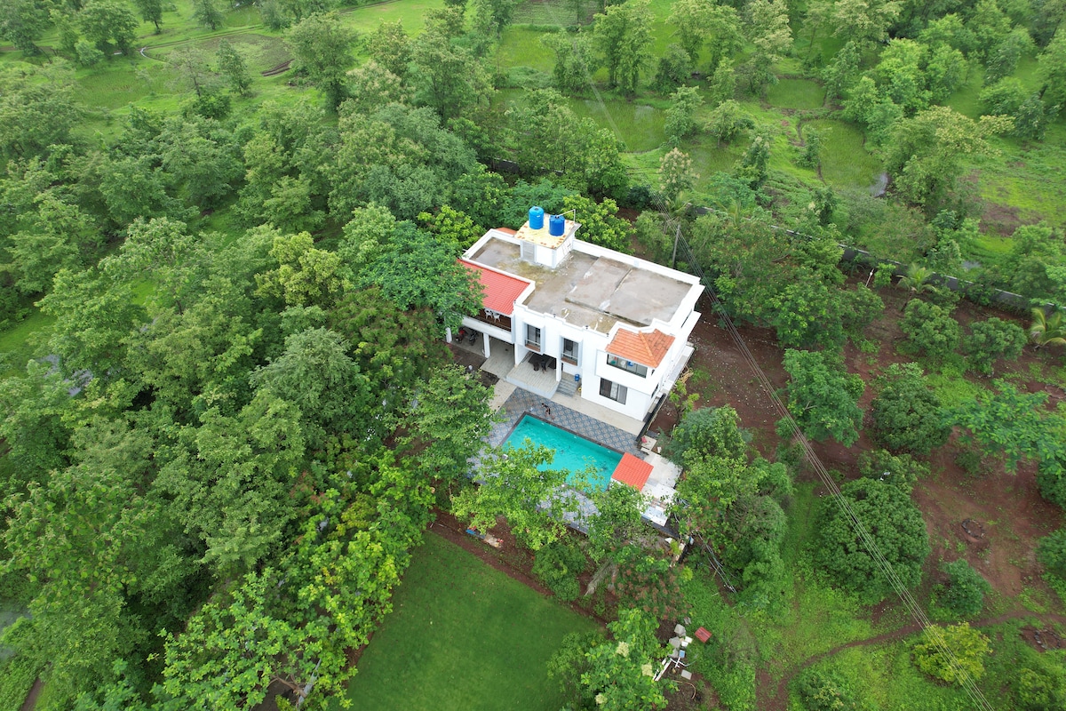 Experimenta un retiro sereno, una pintoresca granja de 3 dormitorios y 4 baños en Nasrapur, Karjat. Este refugio, adornado con exuberante vegetación, cuenta con una piscina, un río que fluye y aparece en Hotelier India. El diseño rústico, hecho con amor, ofrece espacios amplios y abiertos, que invitan a una sensación de libertad y comunión con la naturaleza, un escape ideal para una desintoxicación de la ciudad. Destaca por su compromiso con la sostenibilidad ambiental. Esta villa tiene capacidad para 15 personas durante la noche y 30 personas durante el día, por lo que es ideal para fiestas.