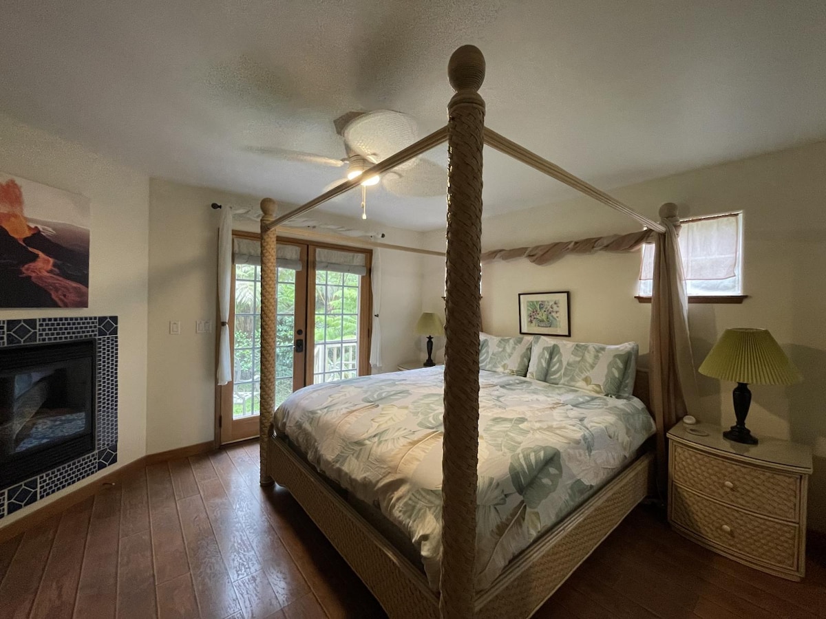 Un romántico estudio en las copas de los árboles de Volcano, a solo cinco minutos del Parque Nacional de los Volcanes de Hawái. La casa del árbol incluye una hermosa cocina, un amplio baño con ducha interior/exterior, un lanai de nivel superior para ver la flora local única y una zona de estar al aire libre cubierta para disfrutar del café de la mañana o el vino de la noche con un ser querido, llueva o haga sol. La decoración interior es tropical de mediados de siglo con ventanales, suelos de madera prístina y una silla de ratán colgante para soñar despierto.